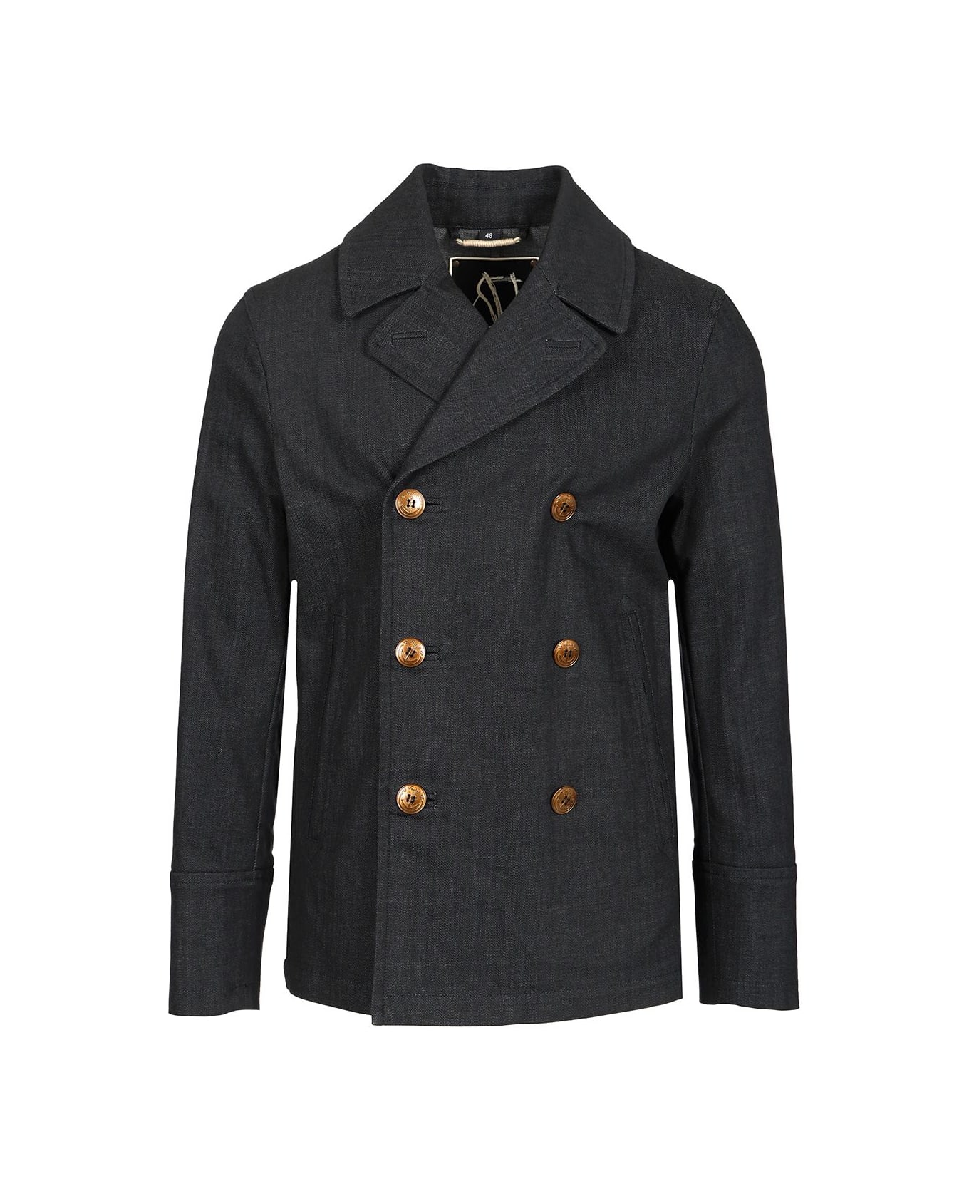Short peacoat in Japanese denim with welt pockets and metal buttons