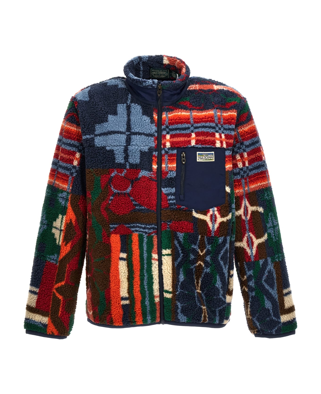 All over print shearling-effect fabric jacket, lining, zip closure, pockets, and long sleeves.