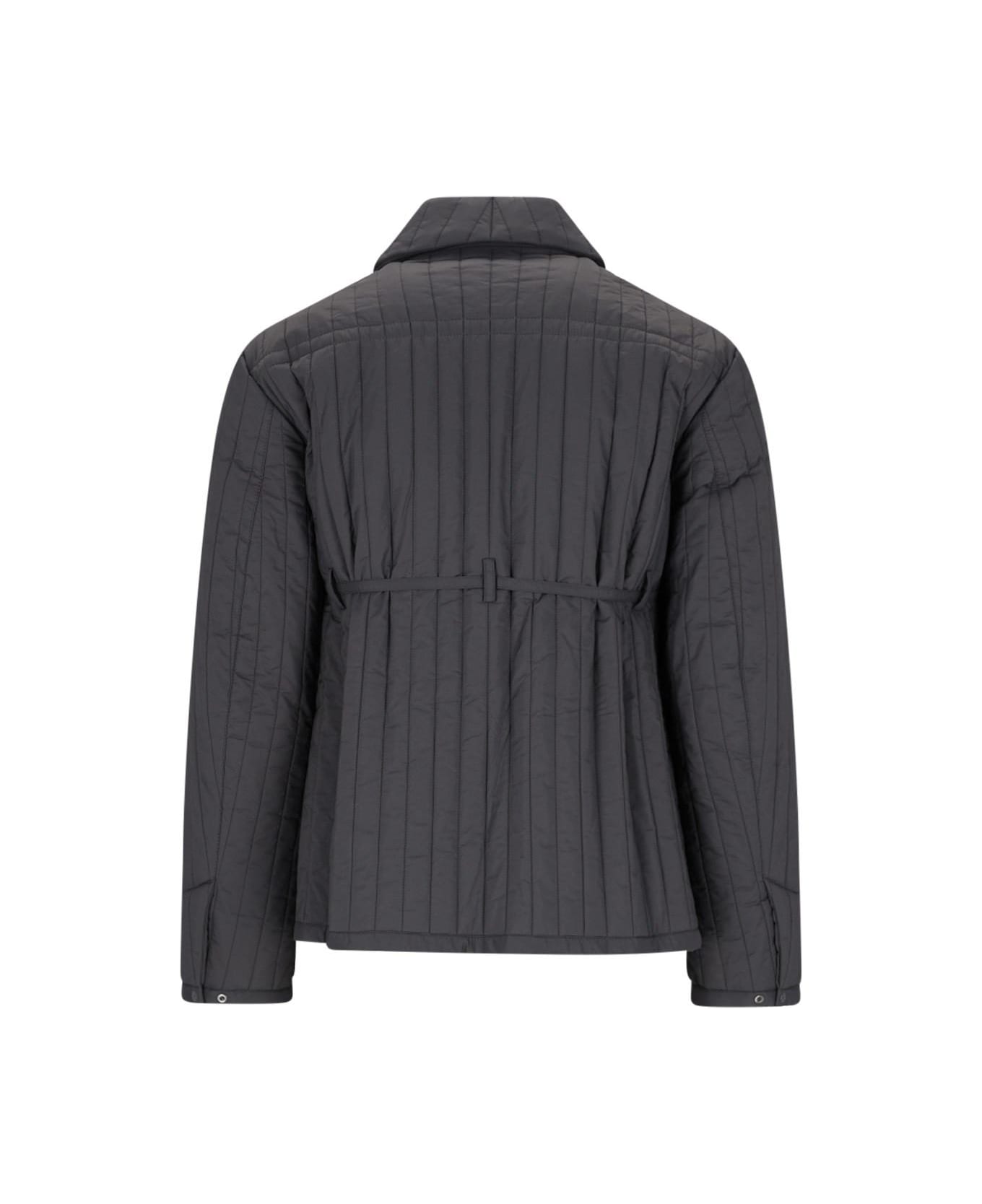 Craig Green gray nylon quilted padded jacket with belt, French collar, snap button closure, belt loops, four patch pockets on the front, straight hem.