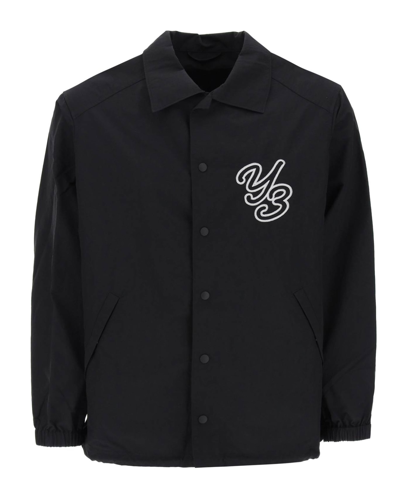 Y-3 shirt-jacket cut from recycled nylon to an oversized fit. Embellished with embroidered lettering at the chest and back, it features a snap-up fastening, pointed collar, elasticated cuffs, and drawstring hem. Unlined, two inside pockets. The model is 187 cm tall and wears a size M.