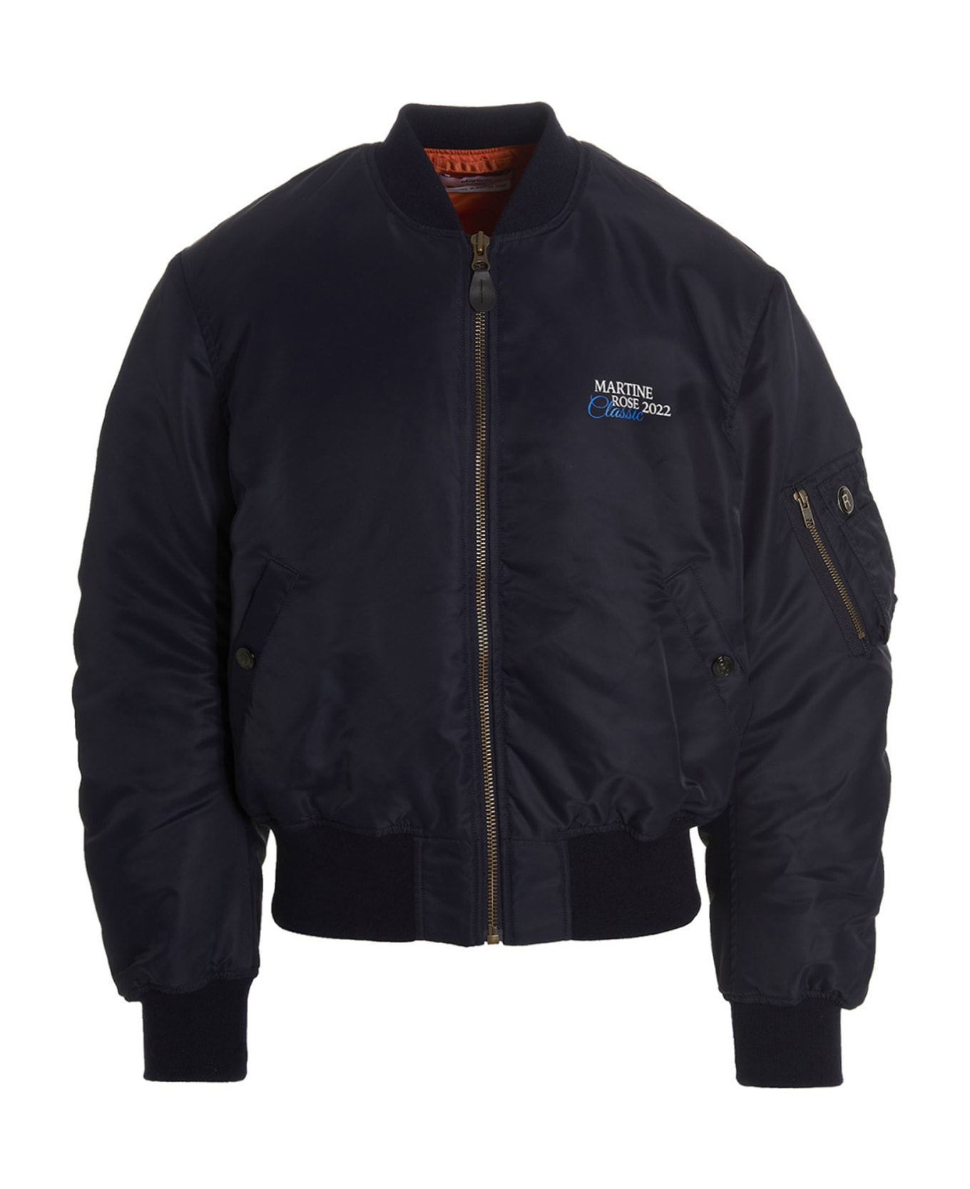 Reversible blue and orange nylon bomber jacket equipped with a zipper closure that does not close on the orange side. Contrasting patch embroidery on the orange side.