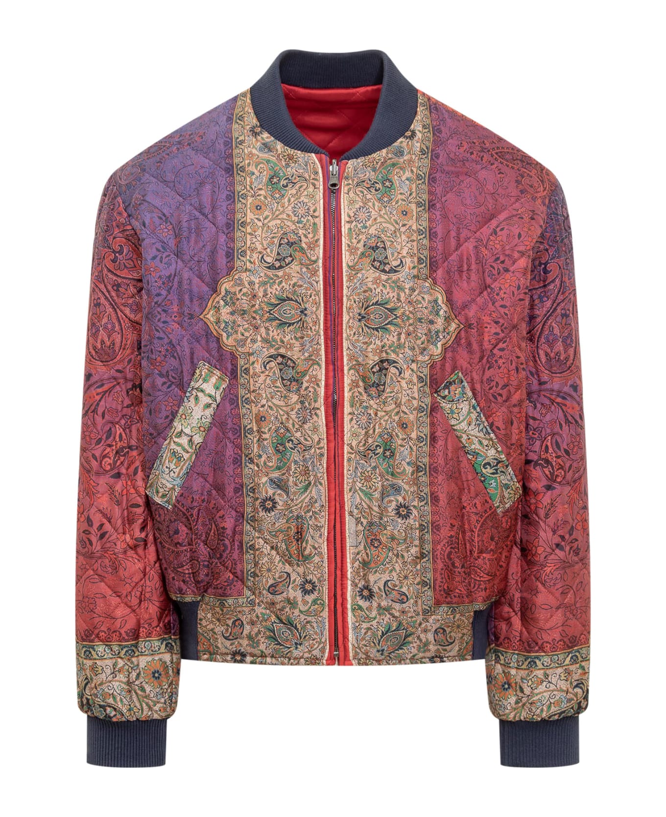Red jacket with long sleeves. Reversible. Quilted. Front zip closure. All-over pattern. Side pockets. Ribbed cuffs and hem.