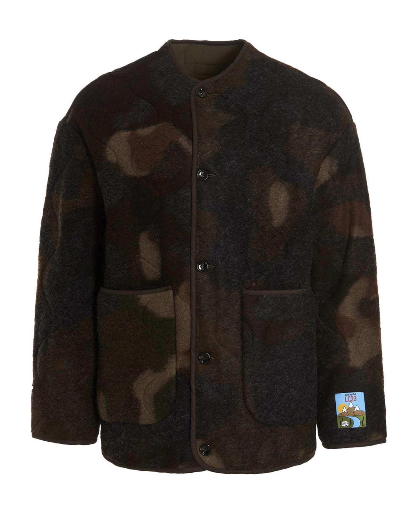 Reversible moleskine jacket in a camouflage patterned wool on one side, plain quilted on the other, featuring a button closure, pockets.