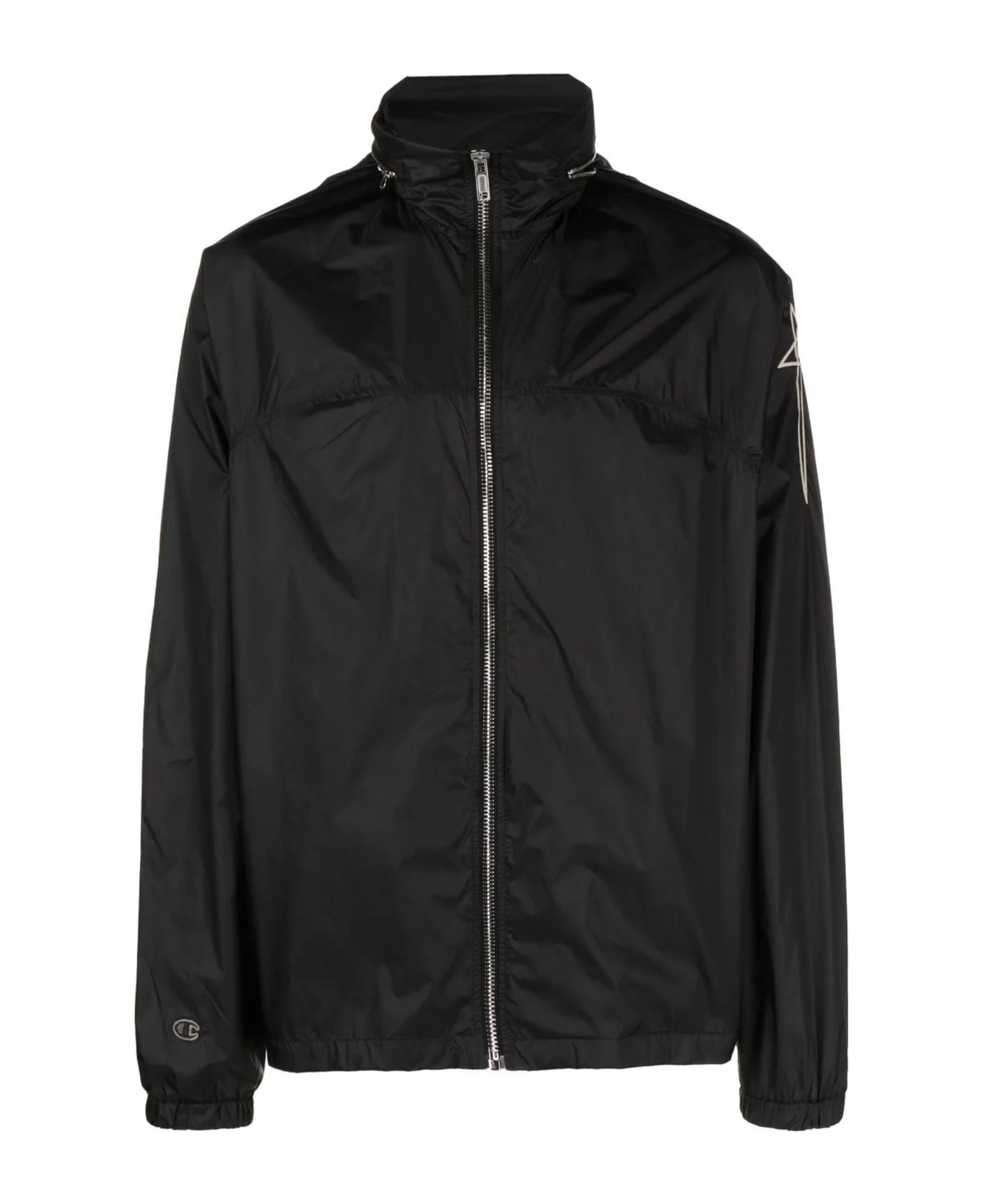 Rick Owens X Champion Mountain Windbreaker In Black Recycled Nylon, It Has A Centre Front Zipper, A Small Funnel Neck With A Horizontal Zippered Pocket In The Centre Back, Concealing A Nylon Hood With Drawstring. It Has A Yoke Seam Line Running Across The Chest, And Elasticized Cuffs. It Features A 3D Embroidered Rick Owens X Champion Pentagram Logo On The Left Upper Arm And A Champion Logo On Right Wrist.