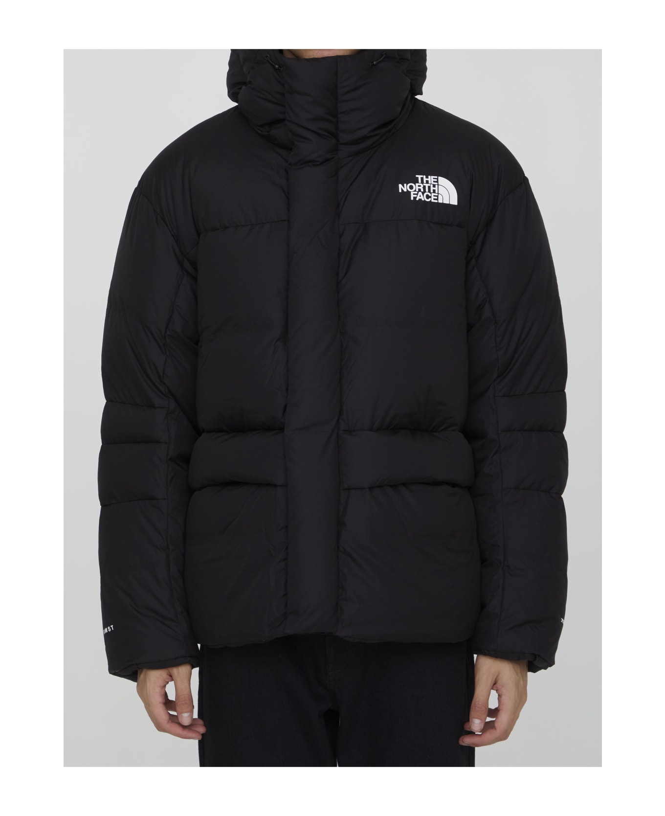 RMST Himalayan Parka in black quilted and padded nylon. It features fixed hood with drawstring, front concealed zip closure, two side welt pockets and white The North Face logo printed on chest and on the back.