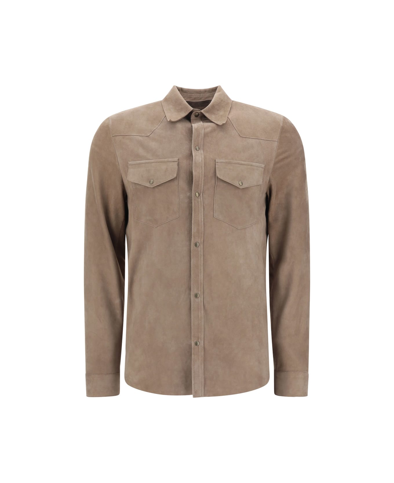 Lambskin shirt by salvatore santoro, classic collar, front button fastening, two patch pockets on front with flap for fastening, adjustable cuffs with button, suede fabric, regular fit.
