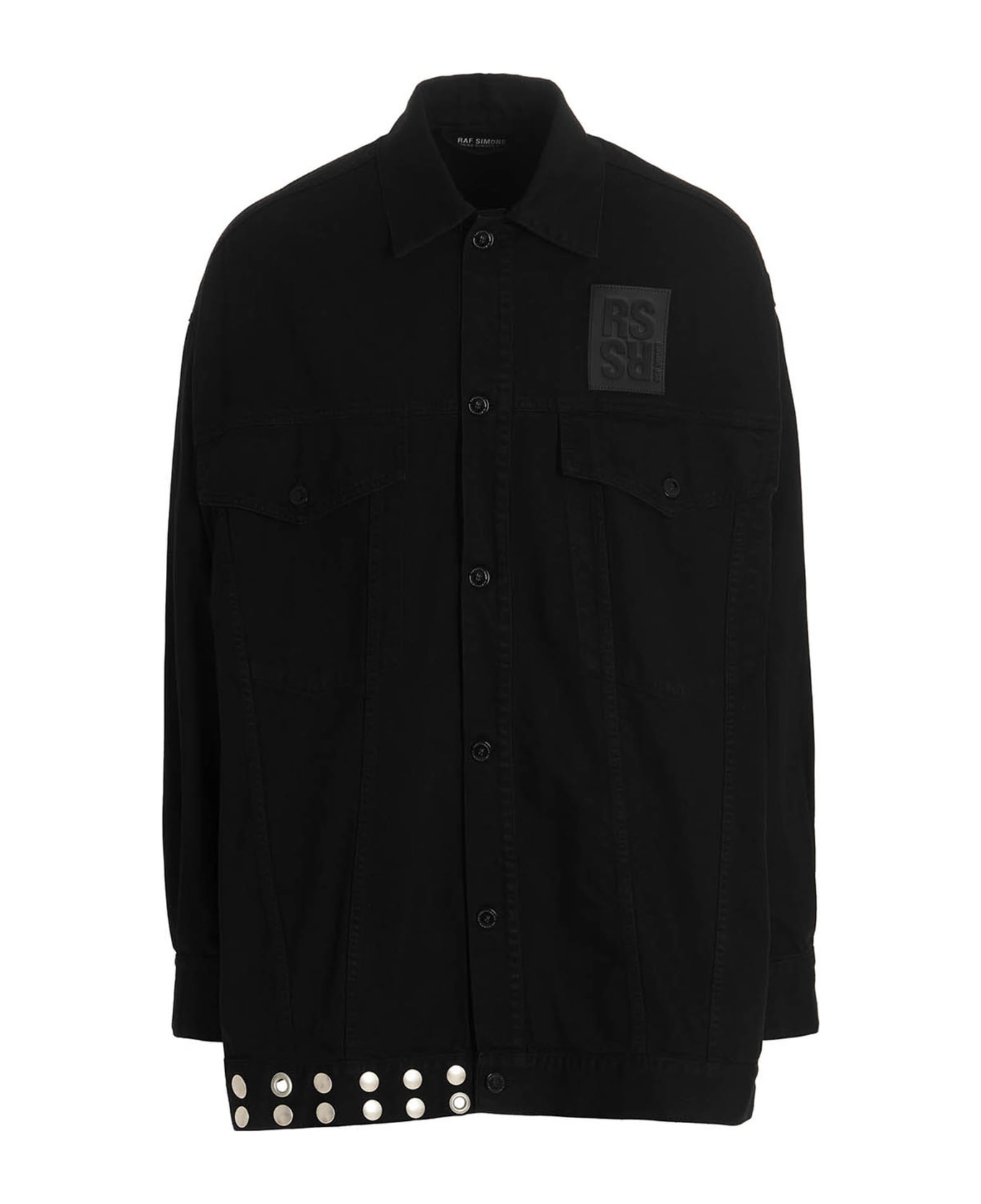 Denim jacket with a fringed leather application at the back and silver metal studs, a button closure, pockets, a front leather logo patch,and long cuffed sleeves.