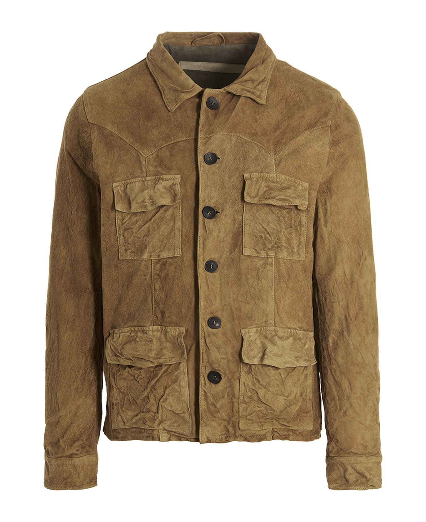 Suede jacket featuring button closure, pockets, and long cuffed sleeves.