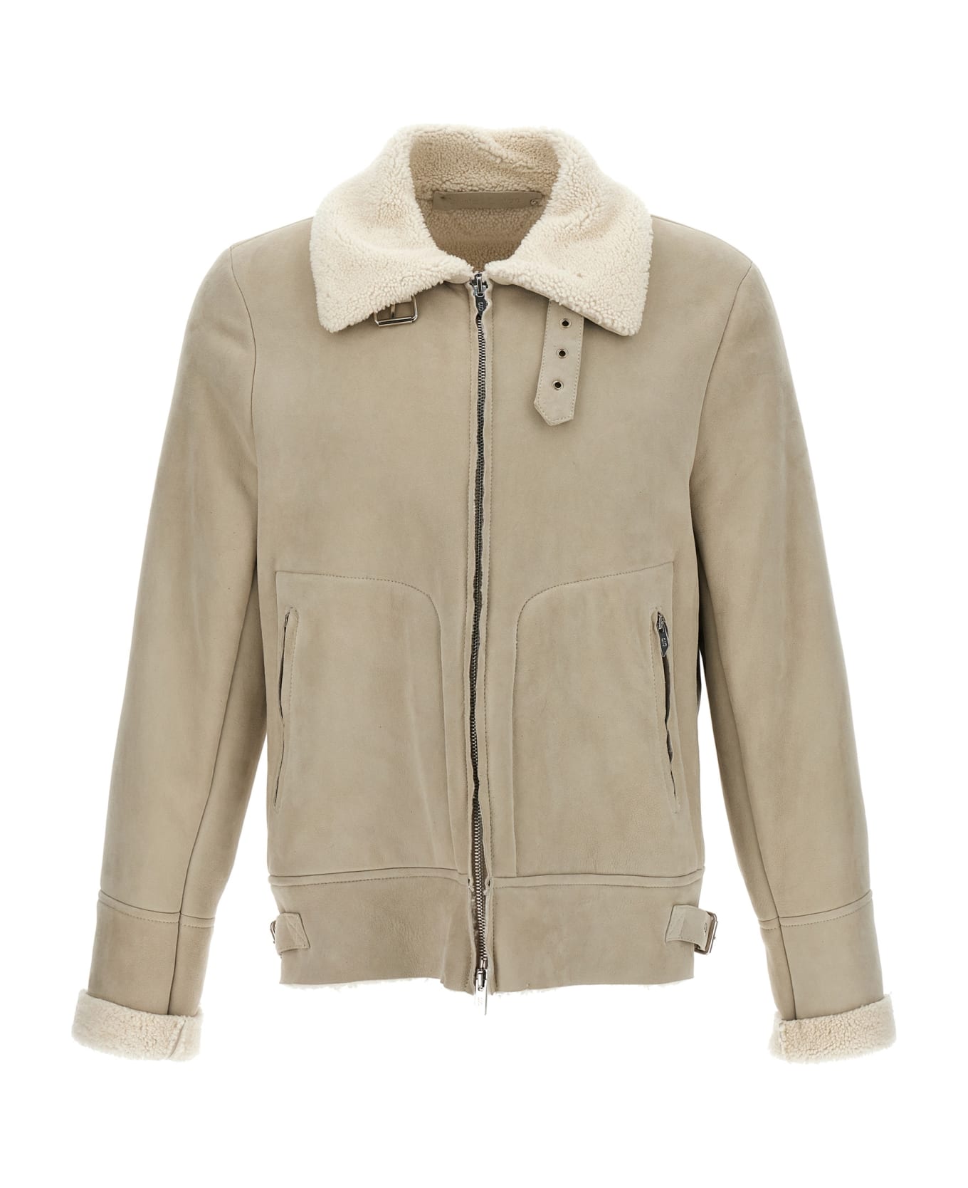 Suede sheepskin jacket with zip closure and contrast collar and pockets.