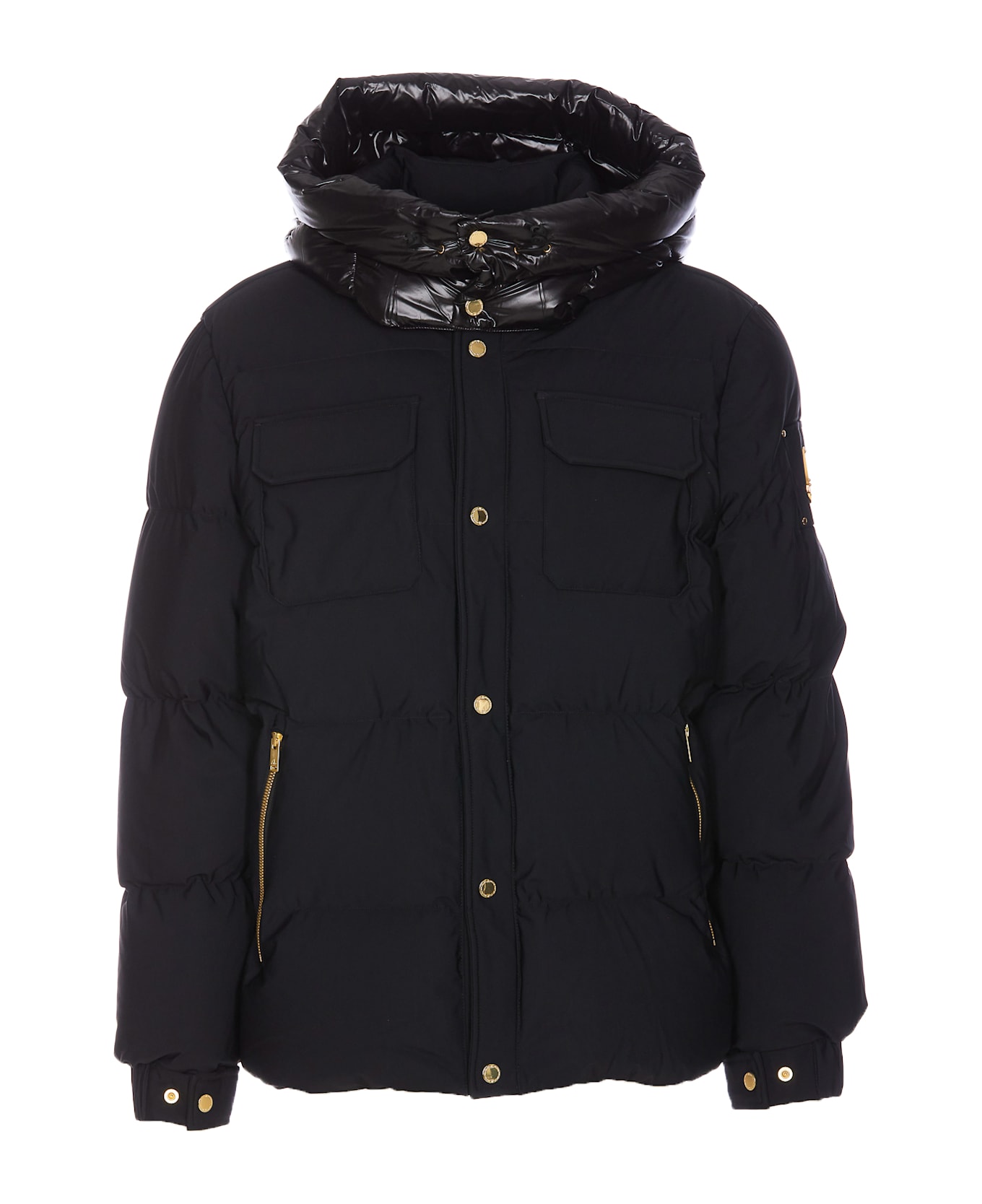 Moose Knuckles black Suthep gold down jacket with frontal zip and buttons closure, removable hood detail, zip pockets, lateral patch logo, padded Composition: 24% Elastane, 100% Nylon, 90% Goose Down, 10% Feathers Composition: 100% Nylon, 76% Nylon, 24% Elastane