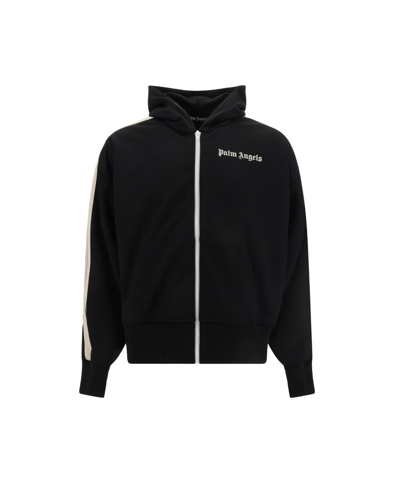 Track hoodie by palm angels, front zipper closure, ribbed cuffs, ribbed hem, two side welt pockets, iconic brand monogram printed in contrast on front, regular fit. Composition: 100% % Polyester