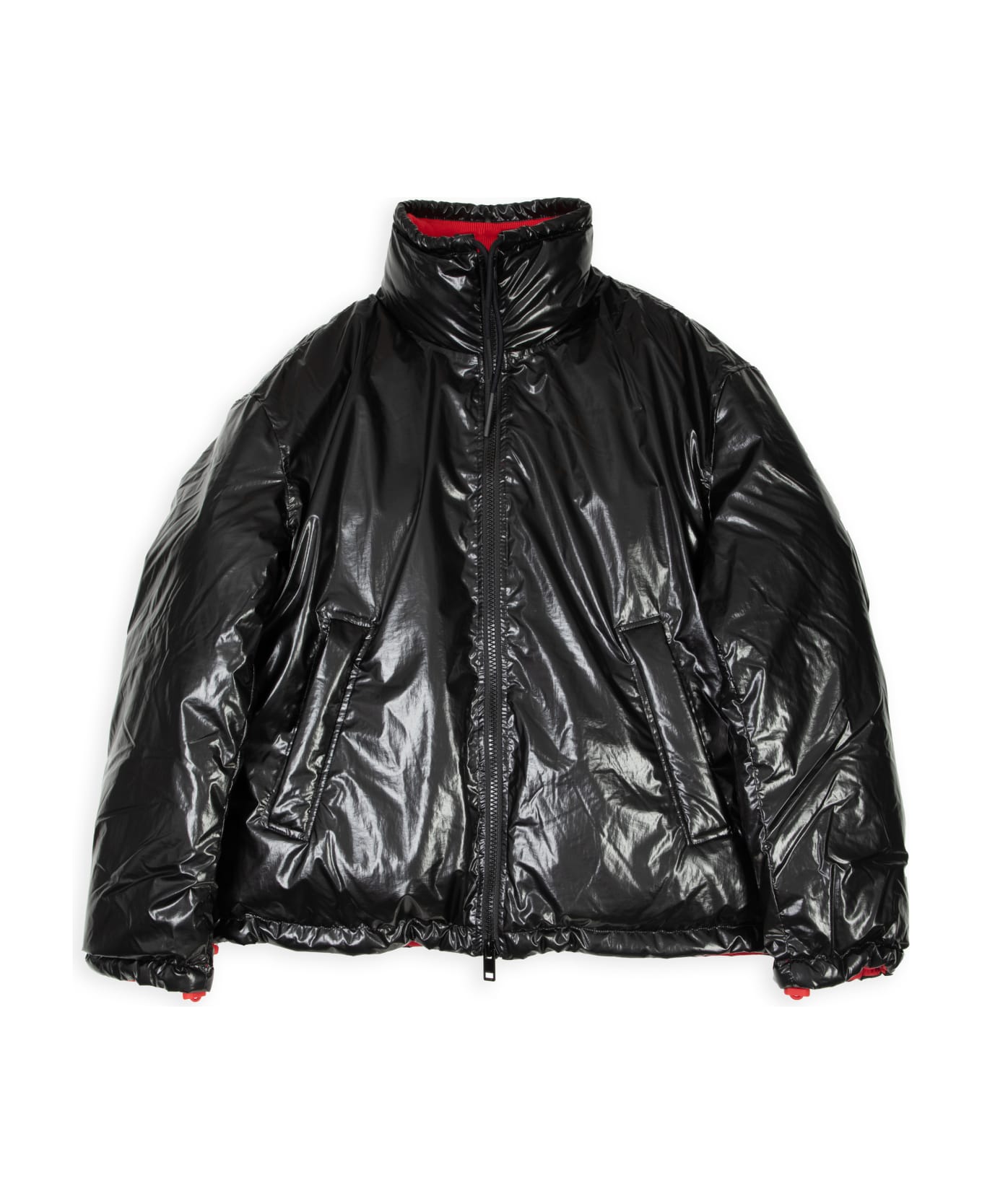 Black shiny nylon puffer jacket with synthetic padding. Stand collar with drawstring. Zip closure. Drawstring at bottom hem. Two side pockets with zip. Embossed logo in red at rear. Loose fit. Composition: 100% polyamide.