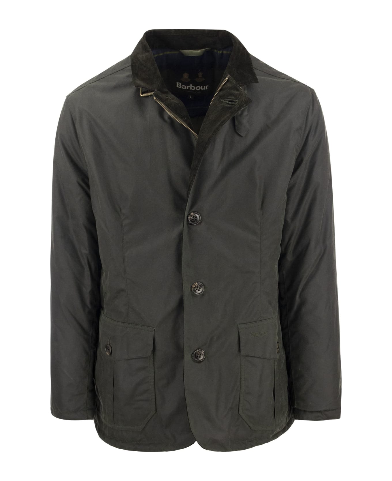 Showcasing a waxed cotton design, the Barbour Winter Lutz Wax Jacket boasts a button front fastening with a stand collar and buckle throat strap. Featuring a smart yet functional layering piece, this jacket offers lower patch pockets and a box quilted lining for added warmth and comfort. A cord trim and tartan inner back yoke exude premium attention to detail. DESIGNER ID: MWX2056 MWX SG51