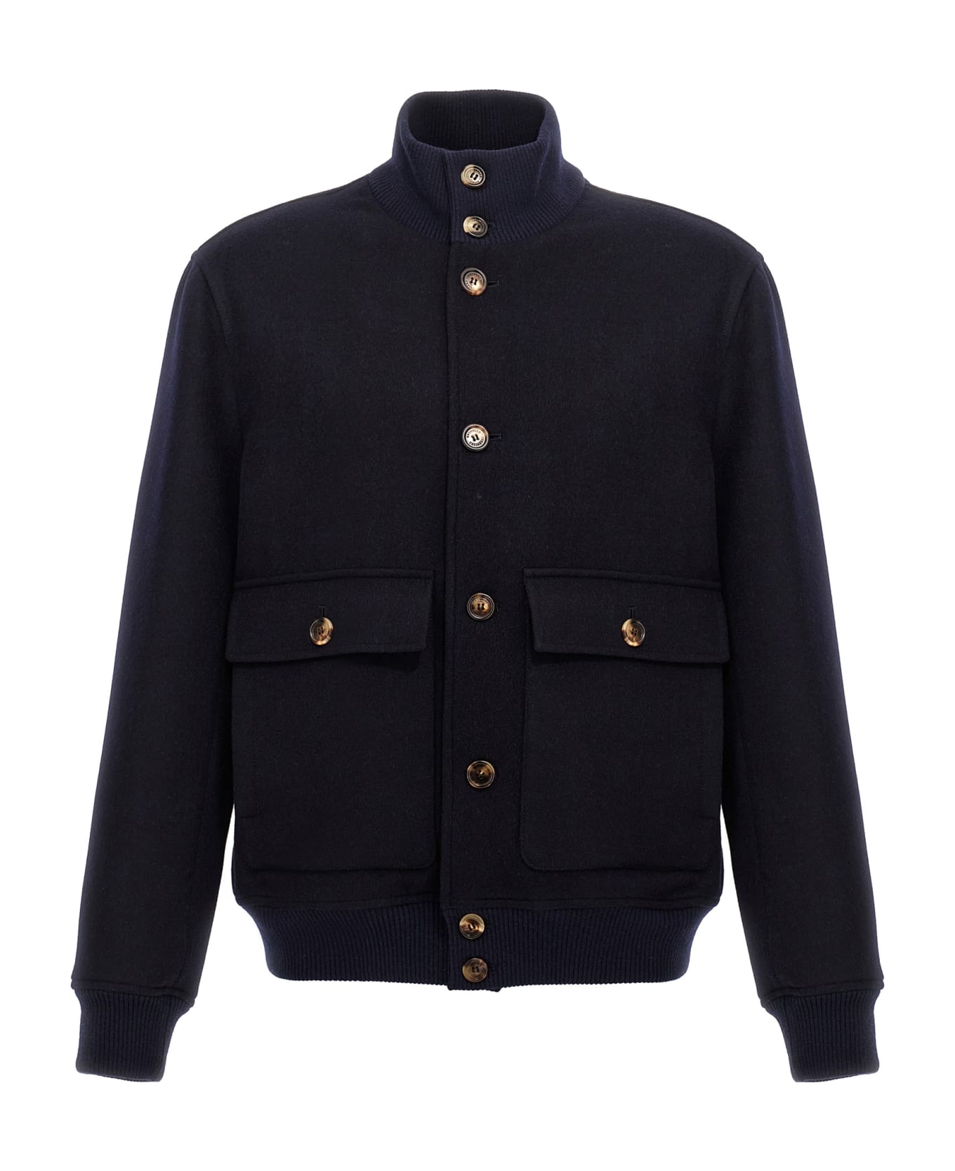 Wool bomber jacket, button closure, pockets, long sleeves with knitted cuffs. Composition: 100% wool