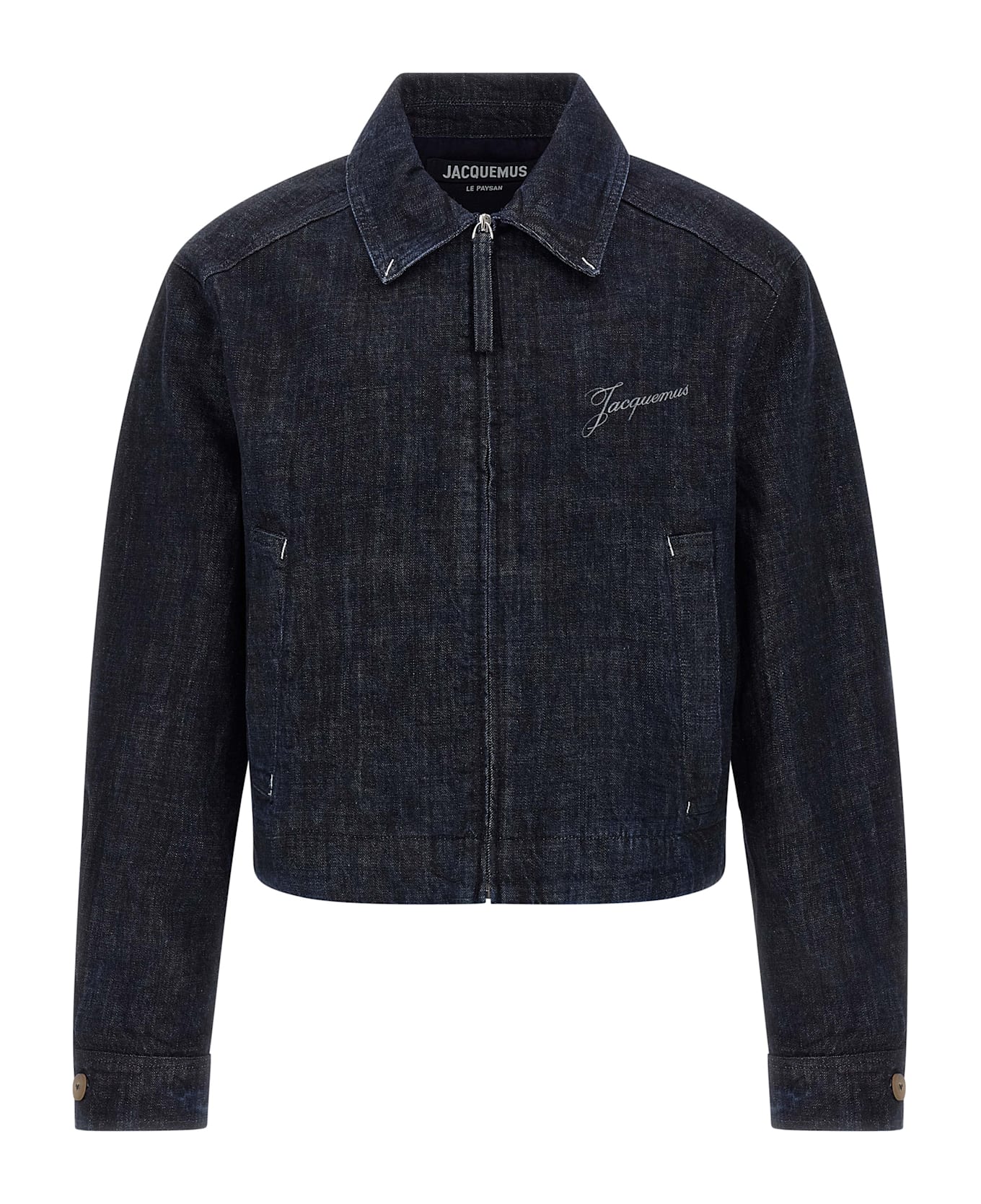'La Veste De-Nîmes Canevas' cotton denim jacket with laser logo print and front zip closure, workwear collar, pockets, long cuffed sleeves, tonal 'Calisson' patch on the back. Composition: 100% cotton