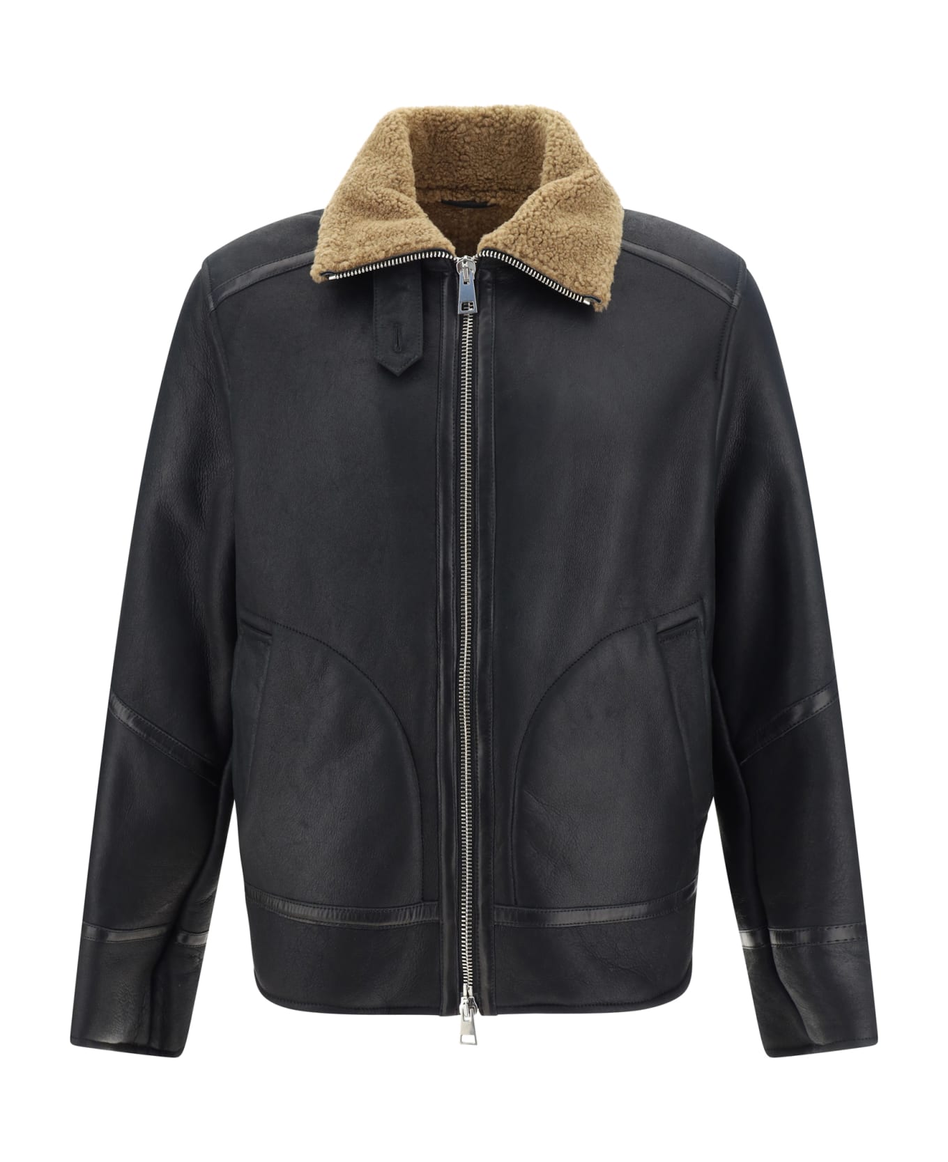 Calfskin aviator jacket by valstar, contrasting shearling collar, front zipper closure, all-over contrast stitching and stitching, two large patch pockets on side panels, regular fit.
