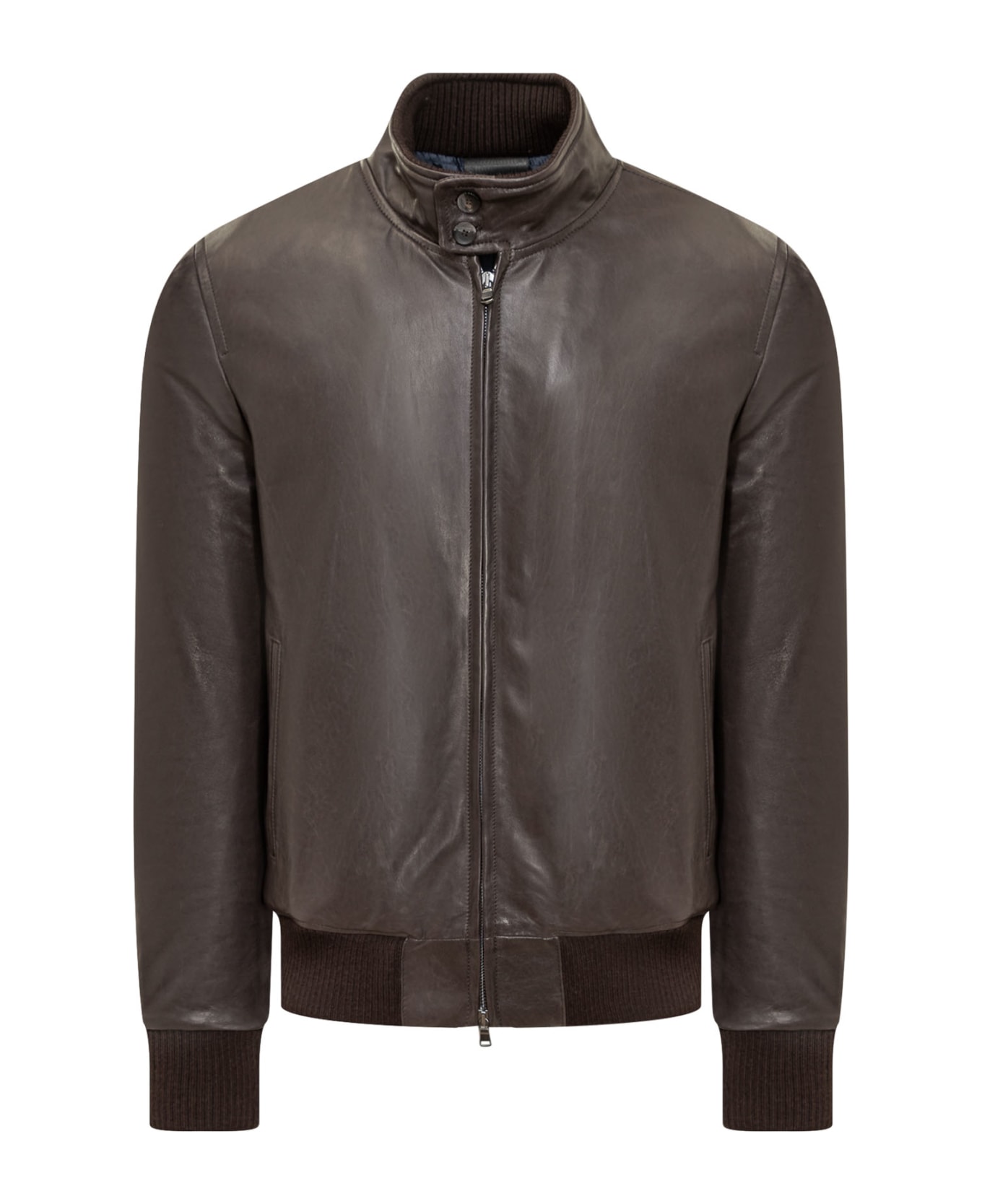 Brown leather jacket. Zip and button closure. Round neck high collar. Pockets cut at the sides. Hem and seat in stretch ribbed fabric.