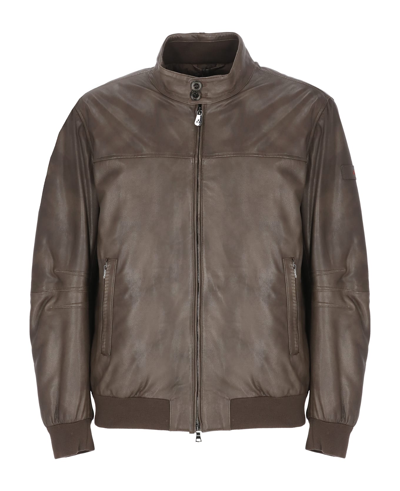 - Peuterey man's brown leather jacket - High neck with buttons - Long sleeves - Contrasting color logoed iconic patch at left sleeve - Two front zip pockets - Front zip fastening