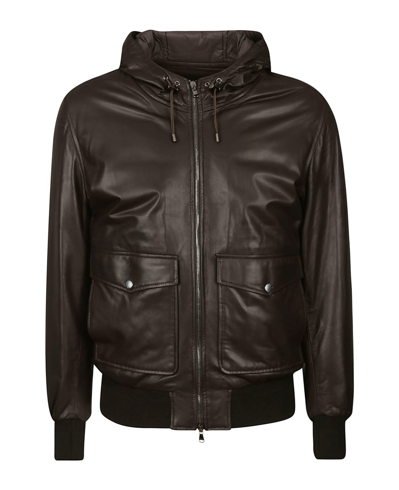 Barba Napoli bomber jacket, made of soft leather on the outside, padded with down inside, hood with adjustable drawstring. Bomber model, with stretch knit trims on cuffs and hem.