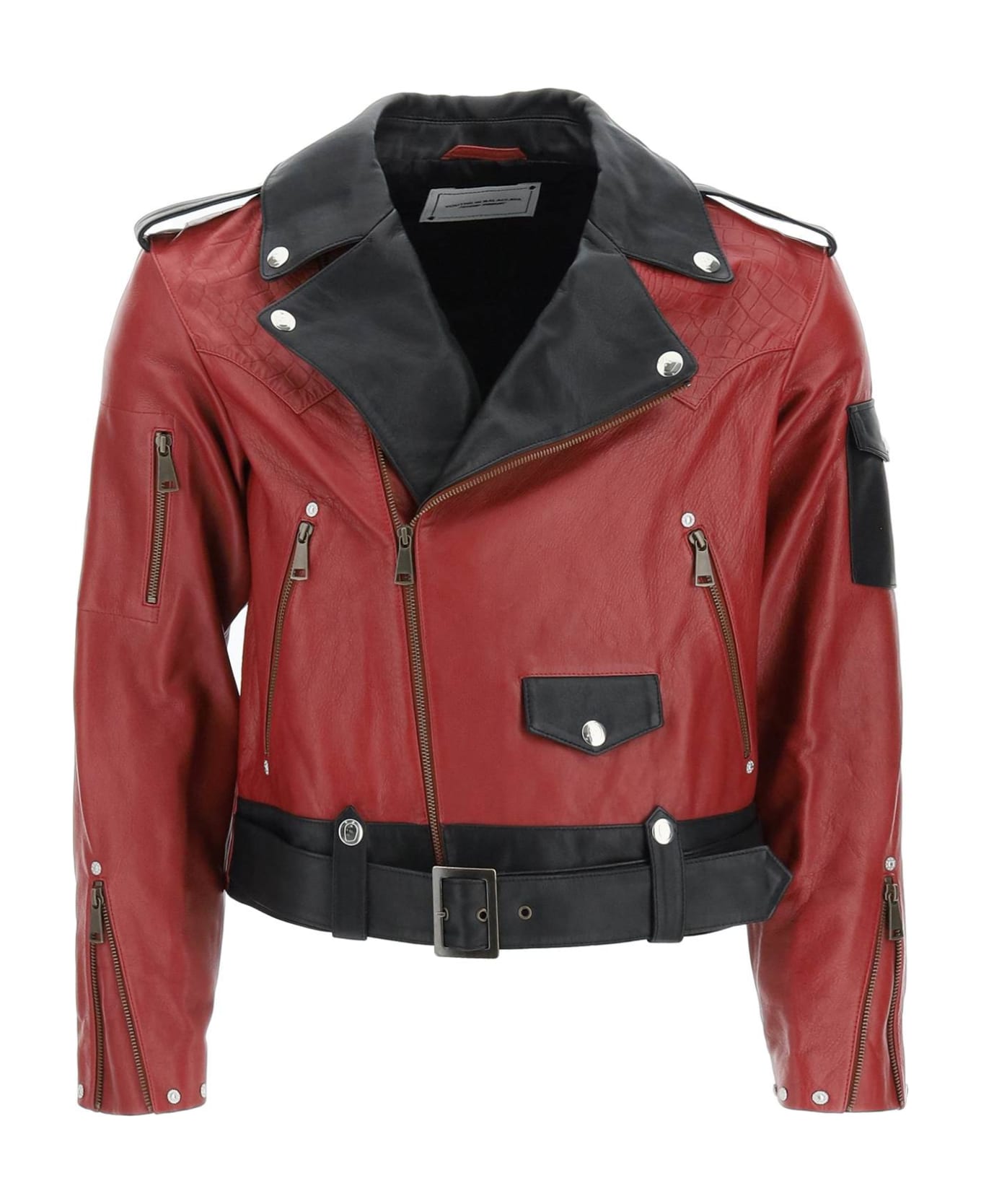 Colorblocked biker jacket by Youths In Balaclava crafted in cow leather with crocodile-embossed western-style yokes. It features a classic asymmetric closure with convertible collar, shoulder tabs, an adjustable belt at the hem, two zip pockets on the sides and two on the back, a front flap pocket and a pocket on each sleeve. It is finished with a star patch and an embossed logo on the back, logo press studs and decorative metal rivets throughout. Full lining. The model is 187 cm tall and wears a size M.