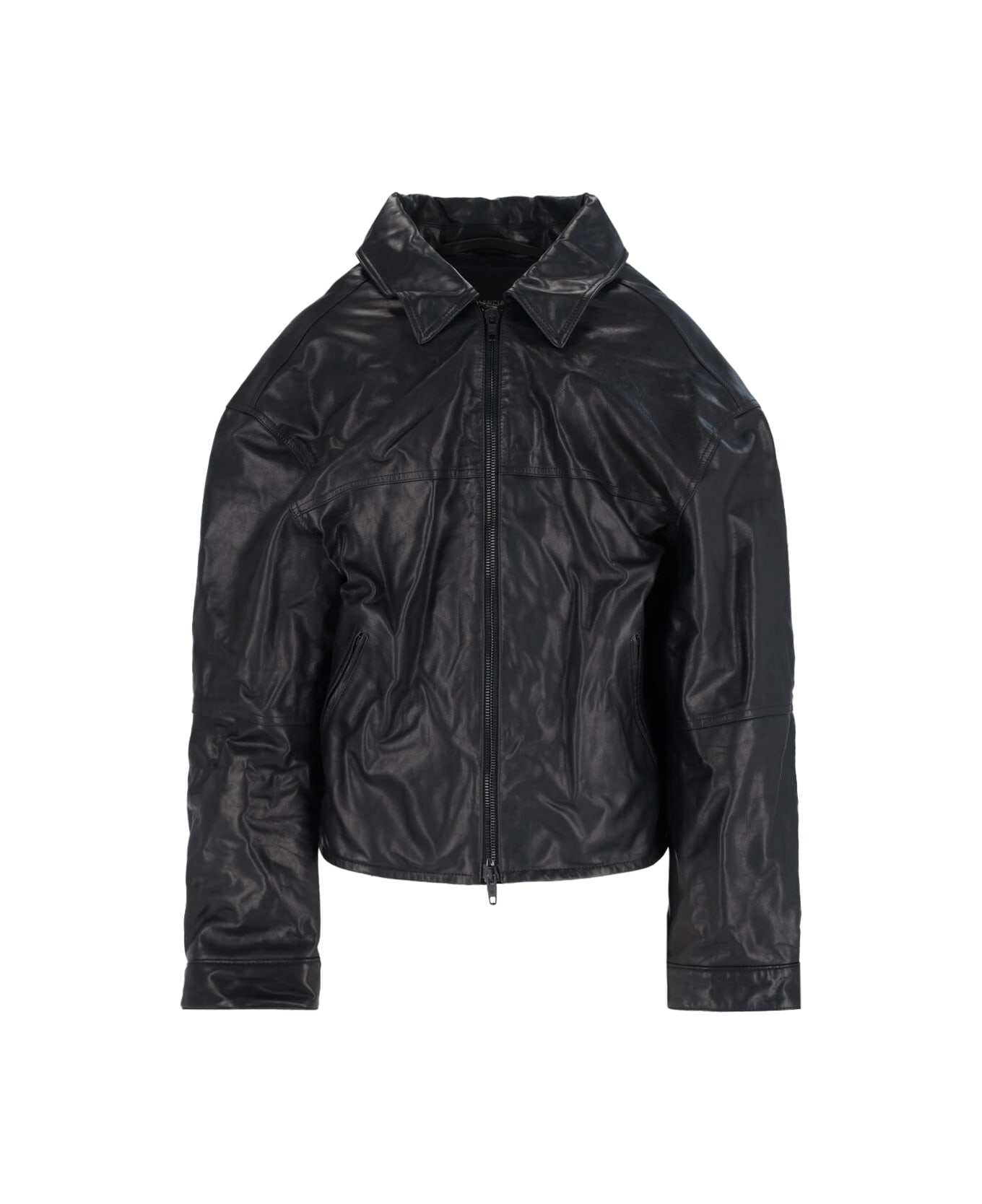 Balenciaga black leather zip jacket with classic collar, double zip closure, two side zip pockets, button cuffs, zip on the cuffs, straight hem. Composition: 100% Leather