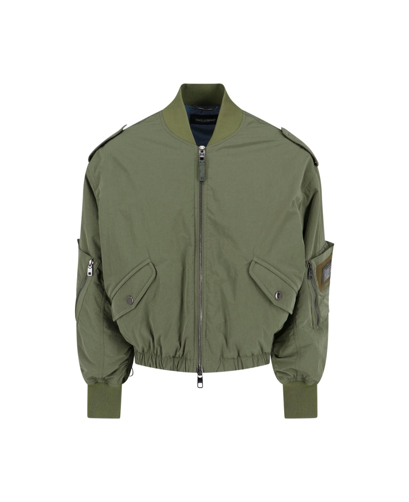 Dolce & Gabbana logo bomber jacket in green cotton blend with ribbed collar, double zip closure, shoulder buttons, two side button pockets, silver metal logo patch on the side, two zip pockets on the sleeves, one inner button pocket, ribbed elastic cuffs, straight elastic hem.