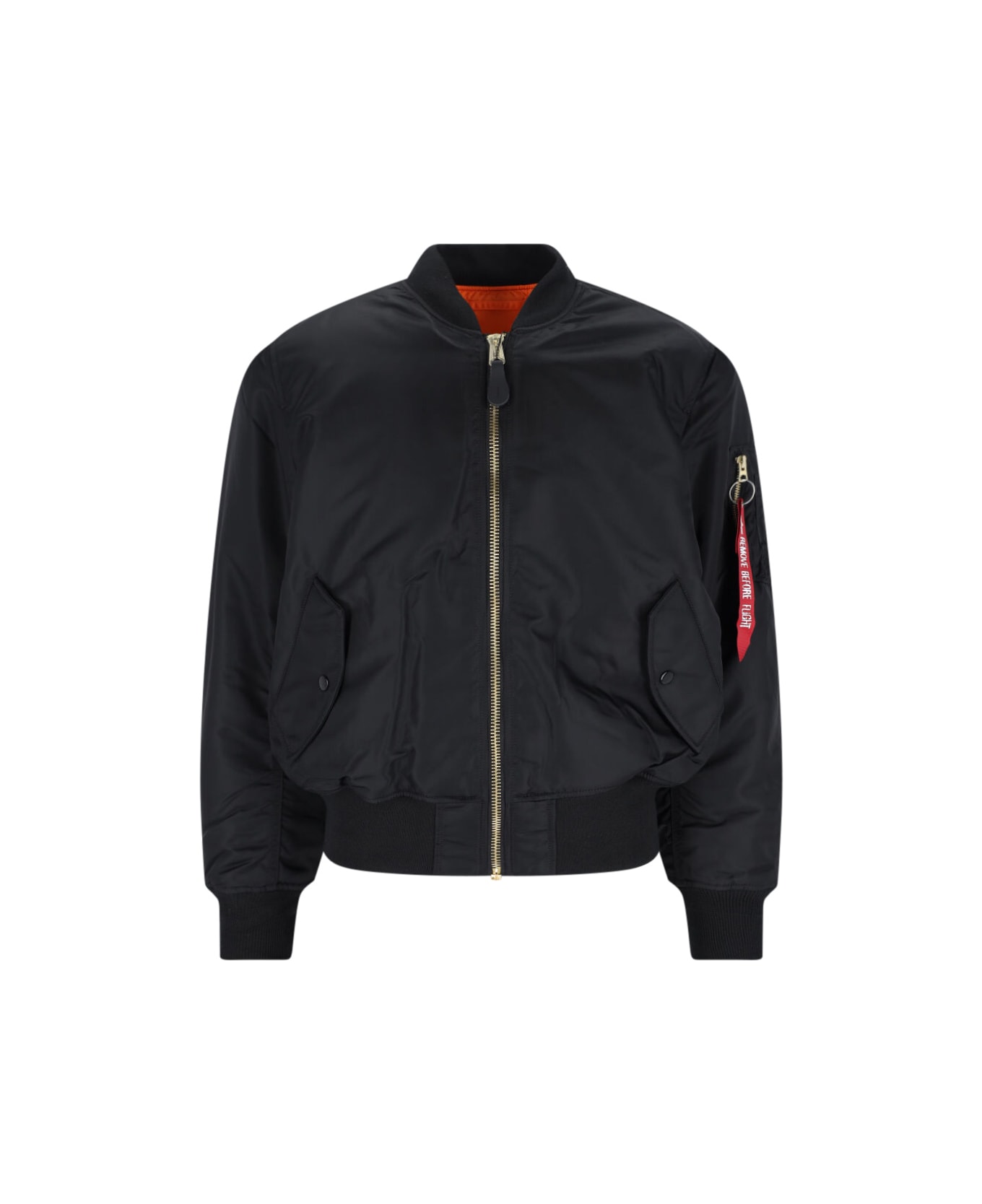Alpha Industries "MA-1 Heritage" reversible bomber jacket in black nylon on one side, orange on the other, ribbed crew neck, zip closure, side zip pocket, red zipper detail, two side pockets, straight hem.