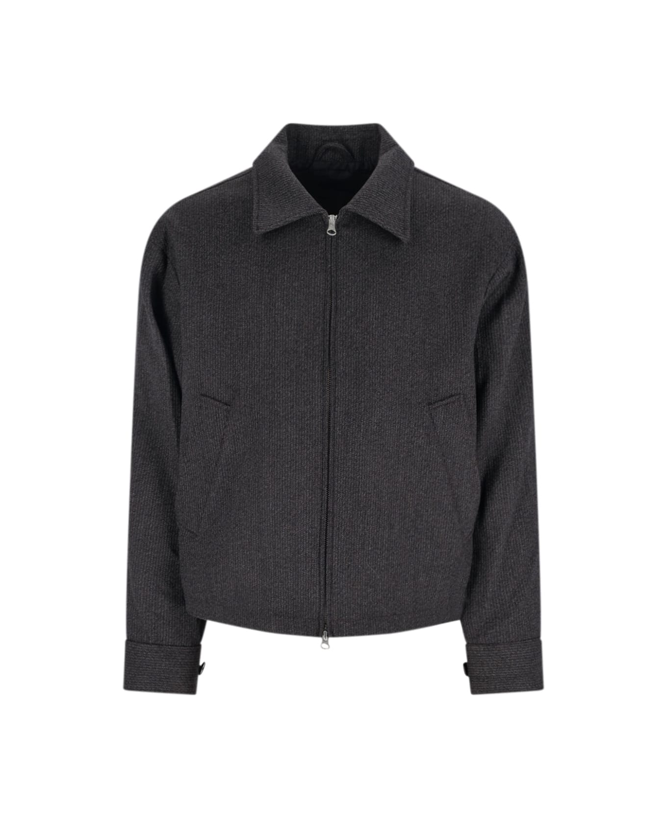 Mfpen 'Mail' dark jacket in brown recycled wool blend with classic collar, double zip closure, two side pockets, inner flat pocket, buttons on cuffs, adjustable buttons at the back, straight hem.