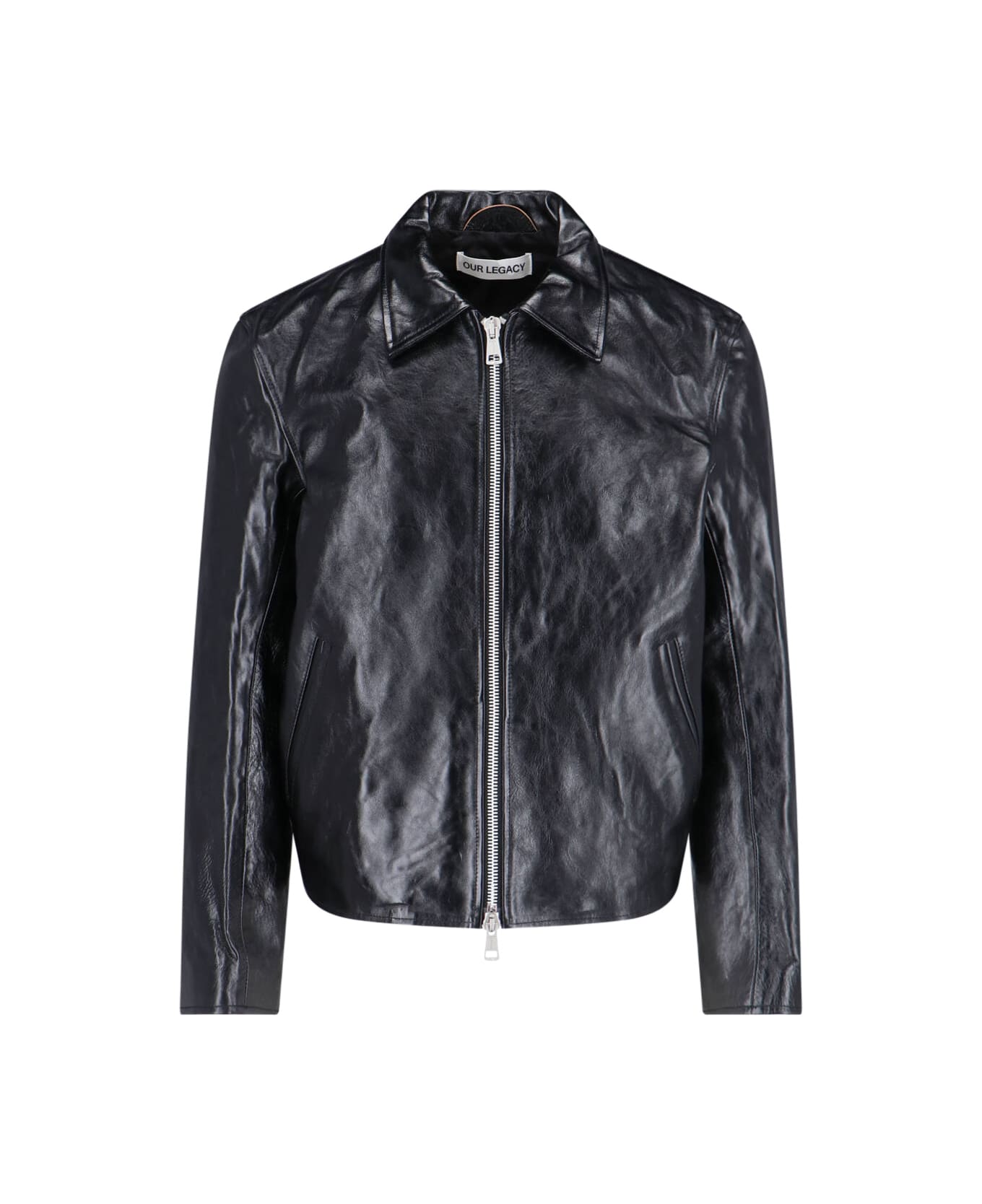 Our legacy mini jacket in black leather with ruffled effect, classic collar, double zip closure, inner flat pocket, two side pockets, straight hem.