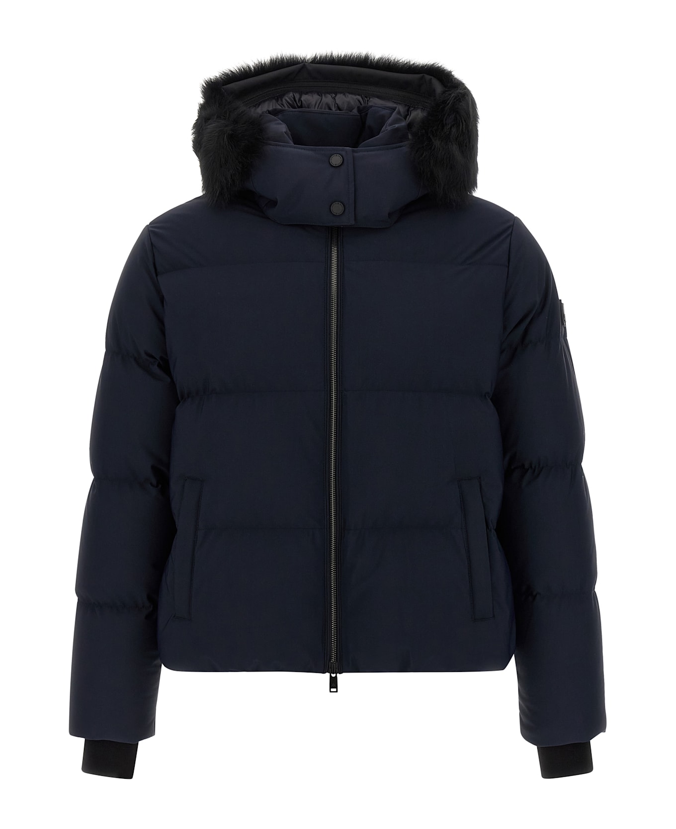 'Misti Puffer' down jacket in water-repellent fabric with goose feather padding, trapezoid silhouette, adjustable and removable hood with removable fur insert, standing collar, front zip closure, pockets, tongue sleeve with knitted cuffs and leather patch with metal logo appliqué, drawstring and knitted gaiter on the hem.
