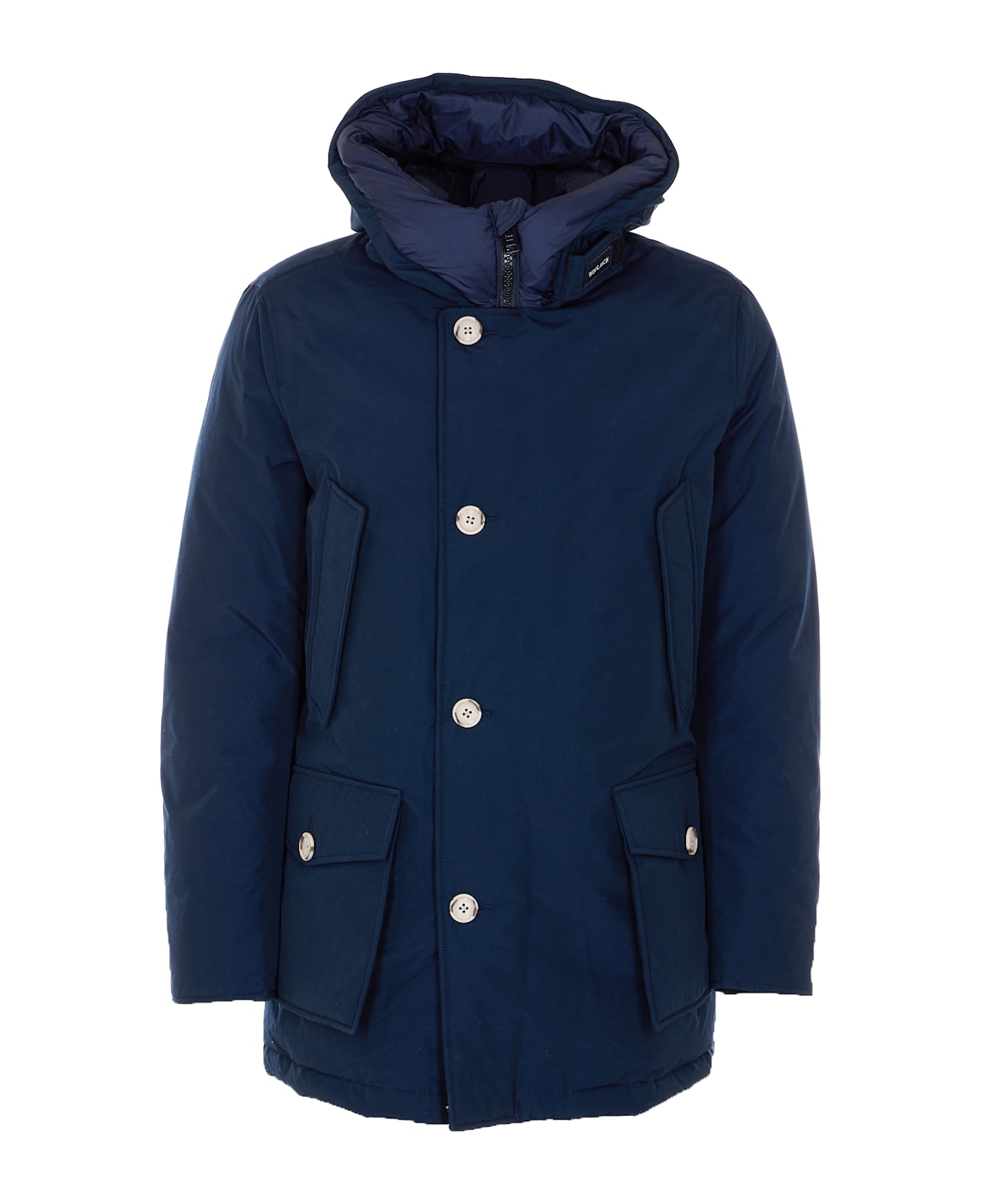 Woolrich blue parka with frontal zip and buttons closure, velcro with logo, hood detail, padded, pockets with button closure,elasticized cuffs