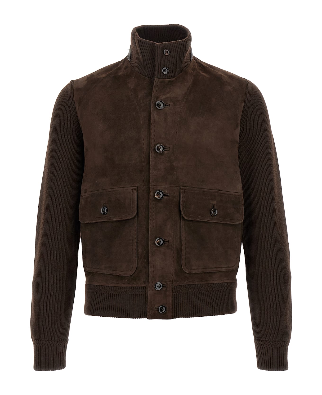 Knitted merino wool blouson with tone-on-tone suede front, high neck with leather detail at the back, front button closure, pockets, long cuffed sleeves.