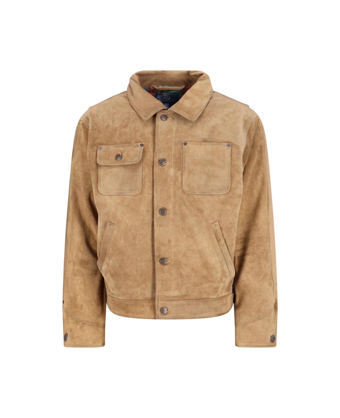 Polo Rlaph Lauren brown suede jacket with collar, button closure, long sleeves, two front pockets, one flap, two slanted side pockets, logo embossed on buttons, straight hem. Composition: 100% Leather
