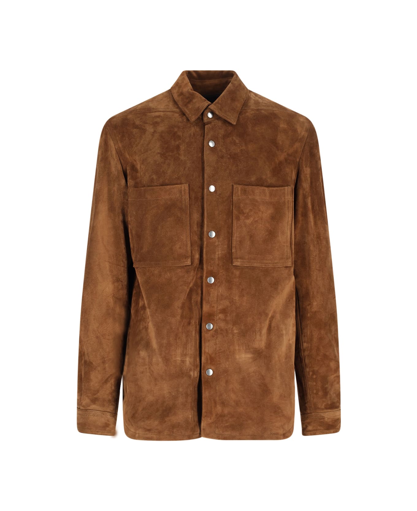 Rick Owens brown suede shirt jacket with classic collar, snap button closure, two front pockets, patch detail at the back, button cuffs, straight hem.