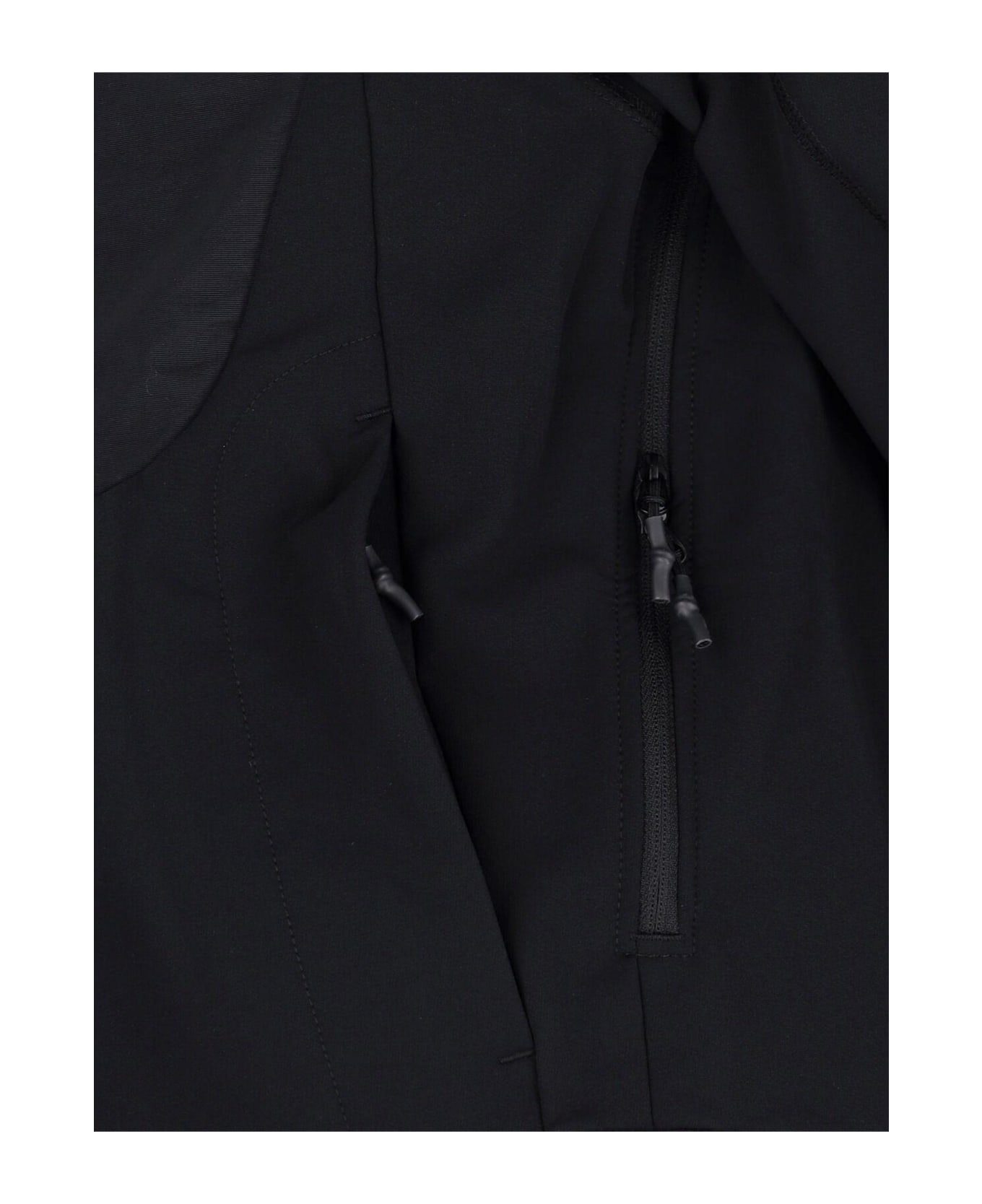 And Wander technical hooded jacket in black water-repellent nylon with drawstring hood, zip closure, adjustable cuff straps, one chest zip pocket, four side zip pockets, gray logo print on the sleeve, elastic details on the hem, straight hem.