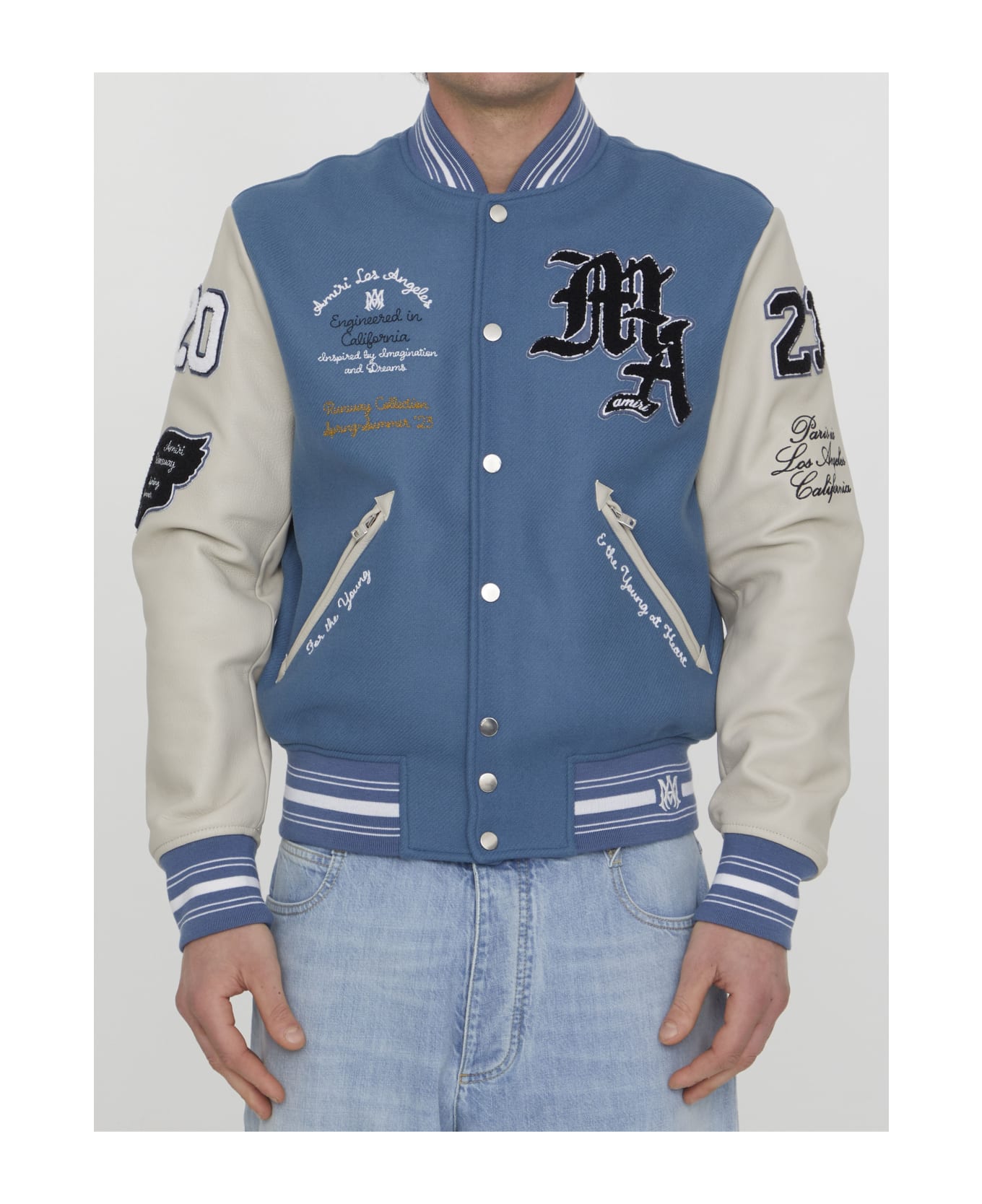 Varsity jacket in wool blend in the shades of light-blue and white with leather sleeves. It features all-over patches and embroideries, Pegasus at the back, front press-stud closure, two side zip pockets and rib-knit striped finishes on collar, cuffs and hem.