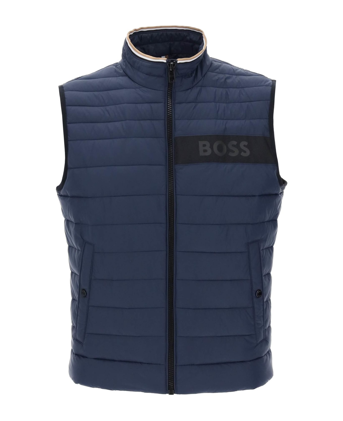 Boss vest crafted in quilted recycled nylon with light padding in recycled polyester fibers and logoed insert in contrasting fabric on the chest. It features striped-fabric-edged stand collar, front zipper fastening, side welt pockets with snap and adjustable hem with inner drawstring. Lined and provided with an internal pocket. Regular fit. The model is 187 cm tall and wears size IT 48.