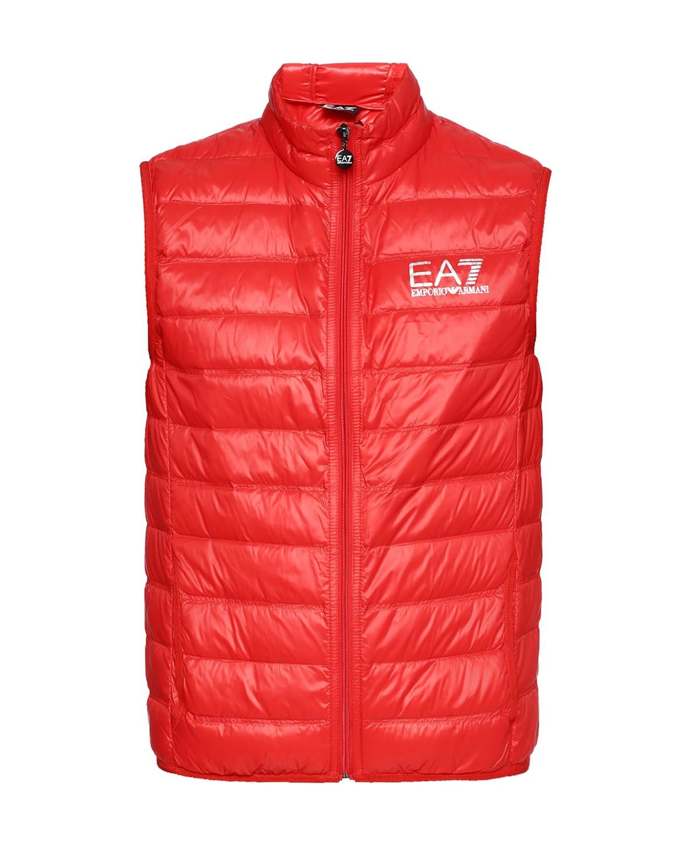 Red quilted down vest from EA7 Emporio Armani. Fastened with zip. Decorated with silver-tone logo. 2 slip pockets at front. Dark grey metal hardware.
