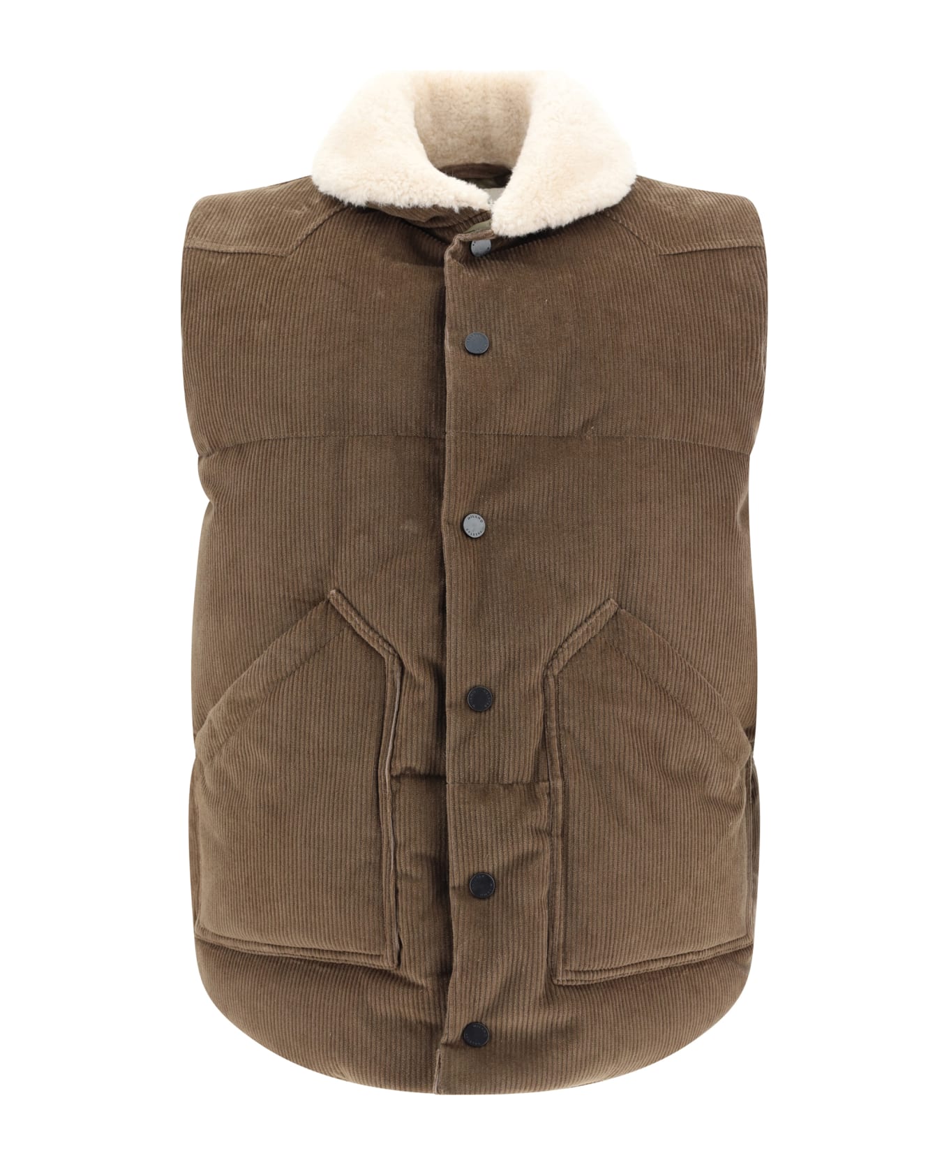 Cotton down vest by valstar, classic faux fur collar, front snap button closure, padded and quilted design, monochrome ribbed velvet-effect pattern, two slit pockets on front, regular fit.