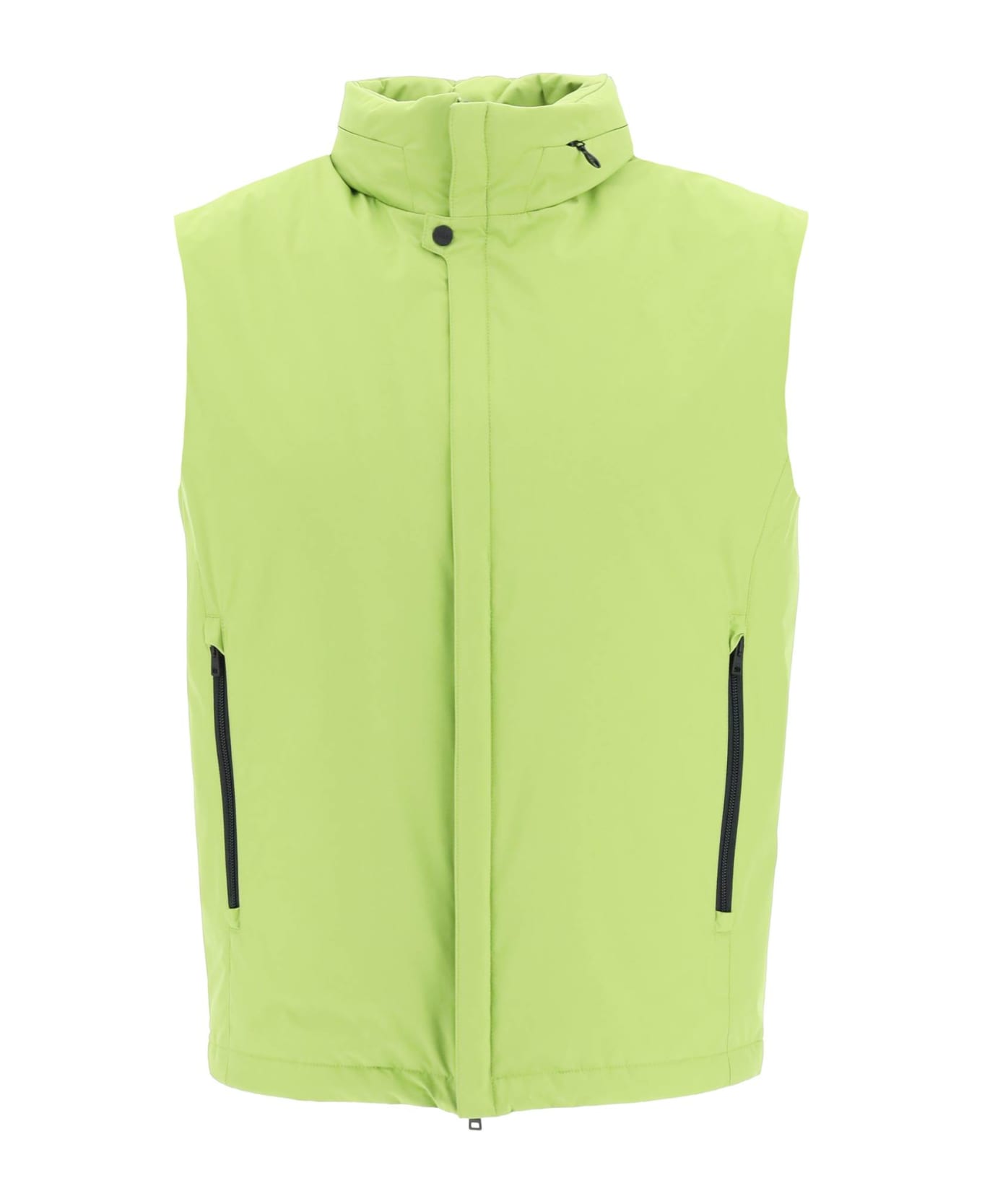 Herno Laminar collection fully lined vest made from Gore-Tex Infinium, a breathable water- and wind-proof technical fabric. Concealed zipper and snap button closure, high collar featuring hidden hood, zippered side pockets, inside pocket. Regular fit. The model is 187 cm tall and wears a size IT 46.