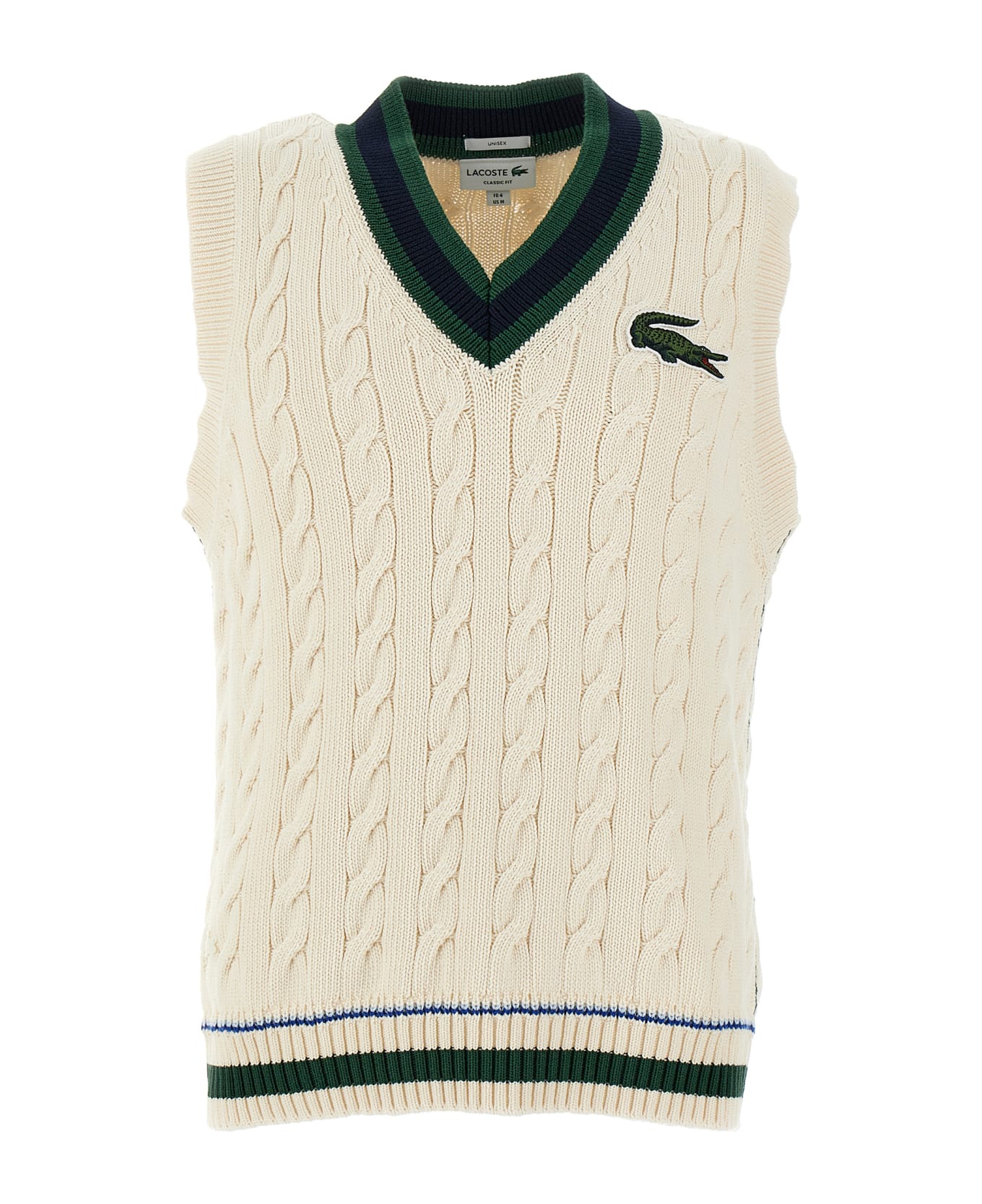 Gilet in maglia misto cotone a treccia, patch logo frontale, scollo a v, bordi a contrasto.