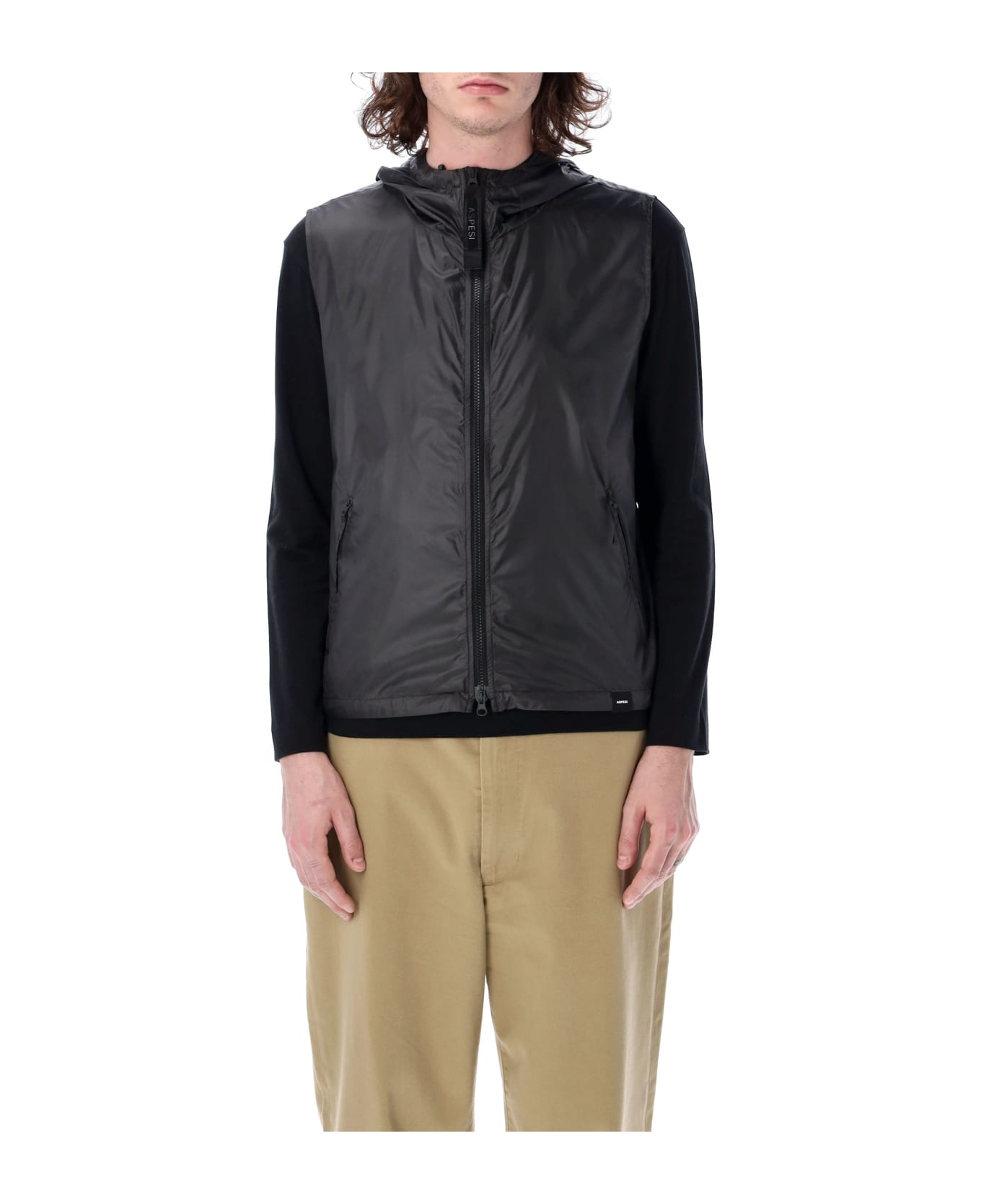 New Giulietta Vest By Aspesi. Featuring: Adjustable Drawstring Hood Sleeveless Full Zip Fastening Lined Elastic Drawcord For Adjustable Measure At Bottom Slanted Piped Pockets Model Is 1,90 M Tall And He Is Wearing Size L