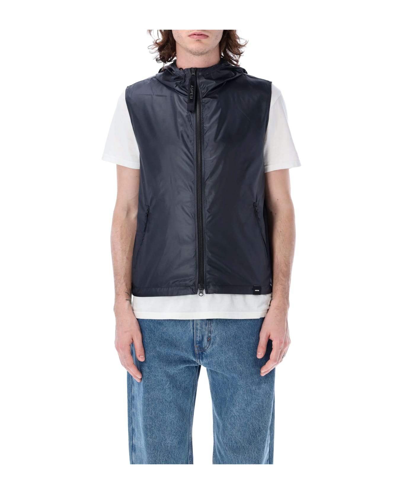 New Giulietta Vest By Aspesi. Featuring: Adjustable Drawstring Hood Sleeveless Full Zip Fastening Lined Elastic Drawcord For Adjustable Measure At Bottom Slanted Piped Pockets Model Is 1,90 M Tall And He Is Wearing Size L
