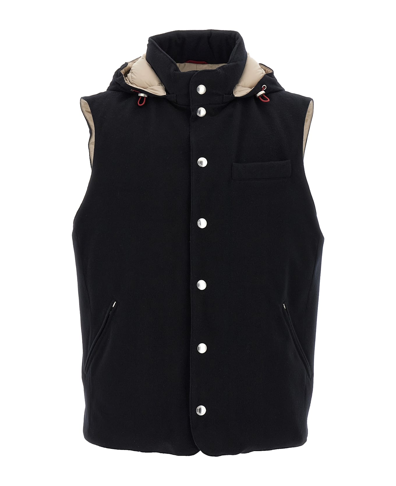 Water-repellent wool vest, quilted nylon lining with goose down padding, adjustable and removable hood, high neck, front snap button closure, pockets. Composition: 100% wool