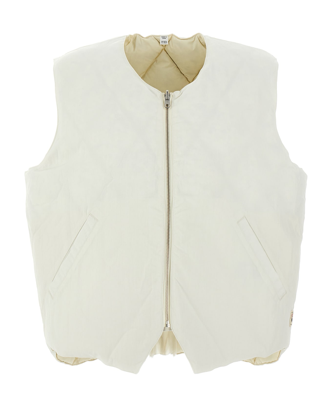 Quilted' reversible padded nylon vest, featuring pockets and a zip closure.
