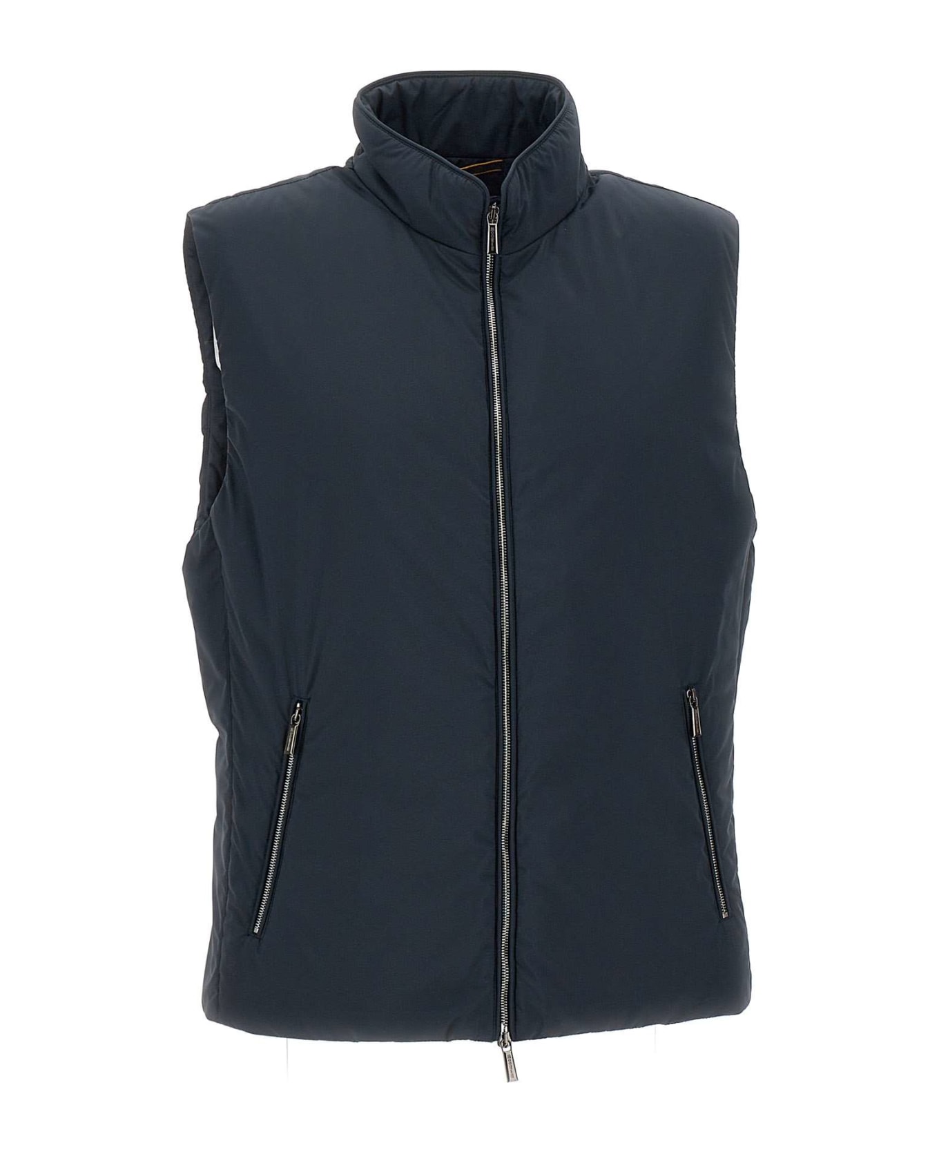 Moorer "Senio Skt" men's vest, dark blue, made of super light opaque 20 denier resin-coated and water-repellent fabric, lining with synthetic feather-effect padding, internal pocket, two external side pockets with zip, double-slider zip fastening, regular fit, perfect for spring and summer season. Made in Italy.