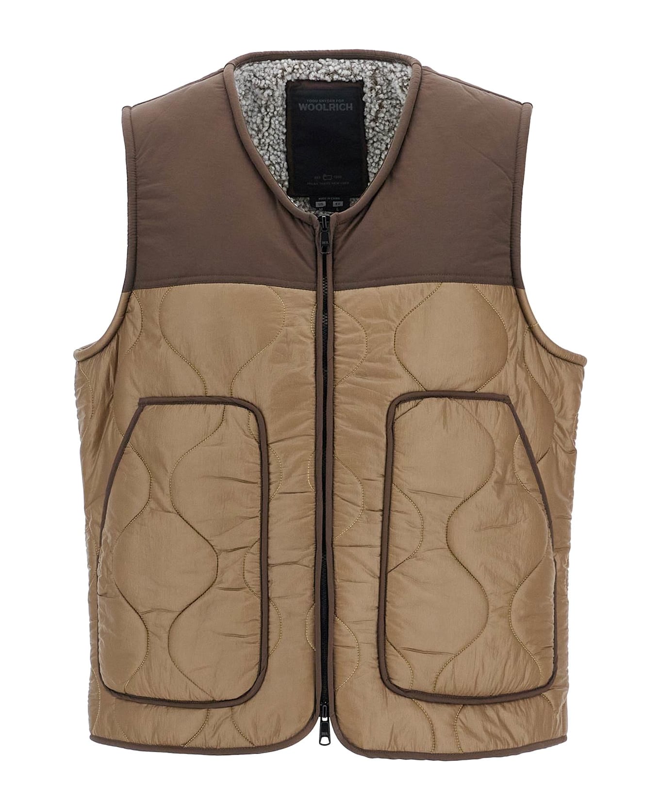 Crafted from Olmetex onion quilted technical fabric, this vest belongs to the Todd Snyder for Woolrich Black Label collection. It features a sherpa fleece lining and contrasting square patterns on the edges. The V-neckline, two-way zip closure, and spacious patch pockets complete the design. Regular fit. The model is 187 cm tall and wears size M.