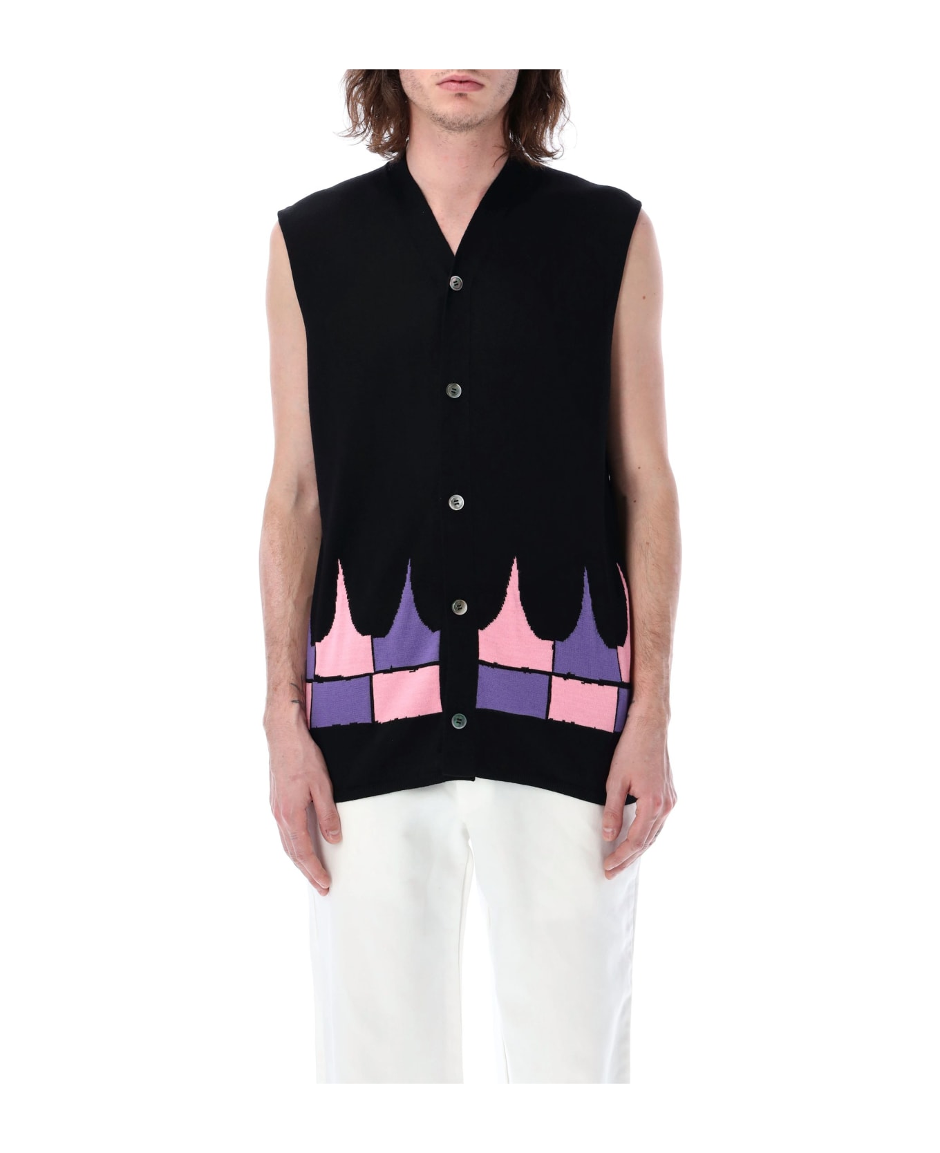 Wool Blend Sleeveless Cardigan By Comme Des Garçons Homme Plus. Featuring: V-neck Sleeveless Buttons Closure Multicolor Motif At Hem Ribbed Hem The Model Is 1,90 M Tall And He's Wearing Size L