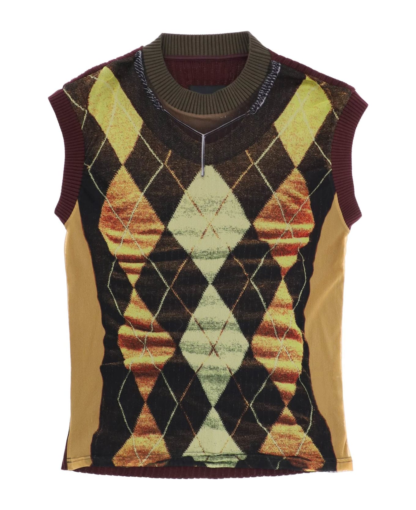 Unisex vest from the collaboration between Y/PROJECT and Jean Paul Gaultier composed by mesh front panel and pure cotton knit back panel. It features trompe l'oeil effect print at front, knit crew-neck and hems, logo label at back. Slim fit. The model is 187 cm tall and wears a size L.