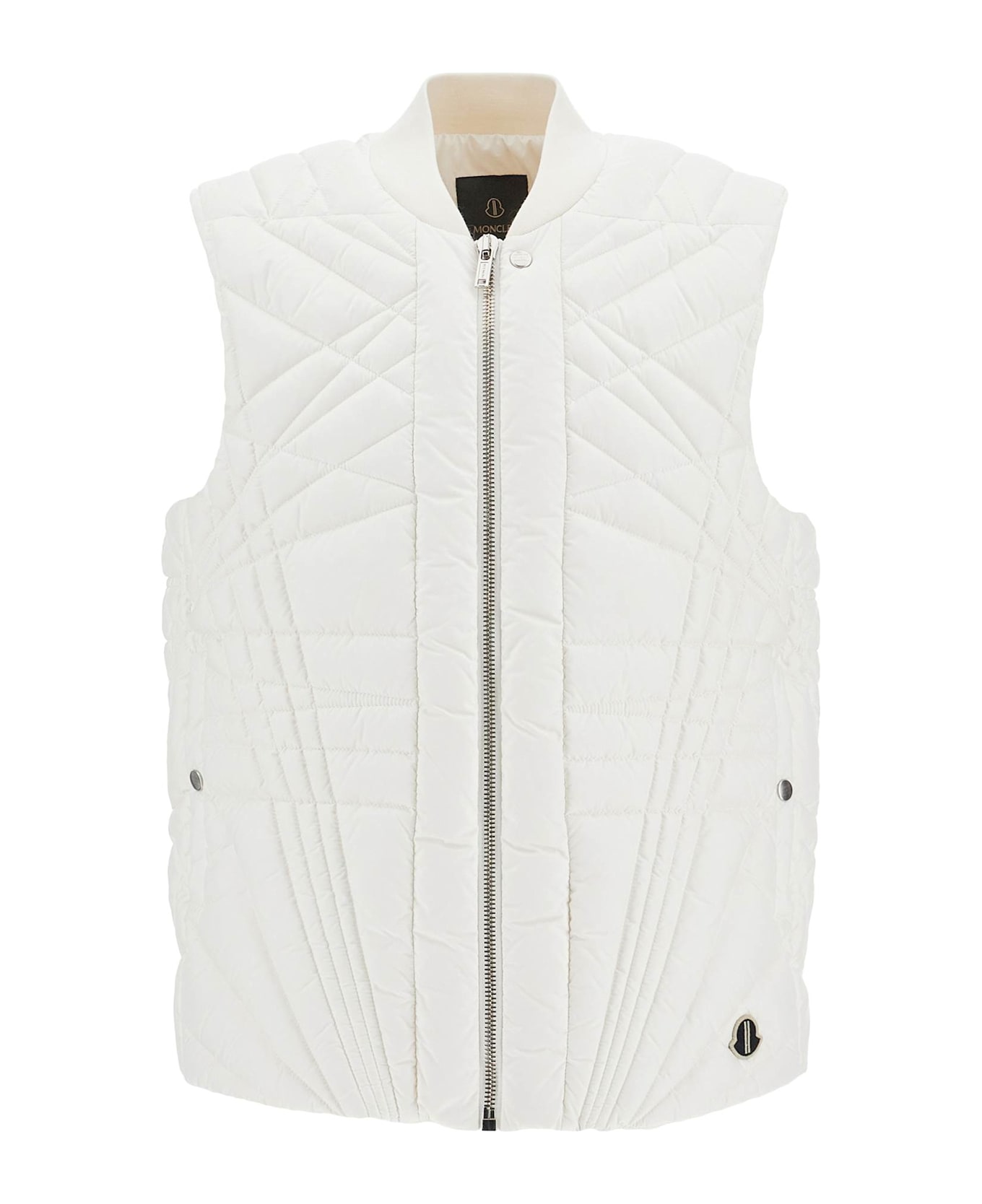 The Moncler + Rick Owens capsule collection presents this padded down vest made from recycled polyester with a graphic Megapenta quilted pattern. It features a ribbed baseball collar, zip closure, side pockets with snap buttons, two inner pockets, and a webbing strap on the back yoke. The collaboration logo is applied at the bottom. Regular fit. The model is 177 cm tall and wears size 0. The male model is 182 cm tall and wears size 2.